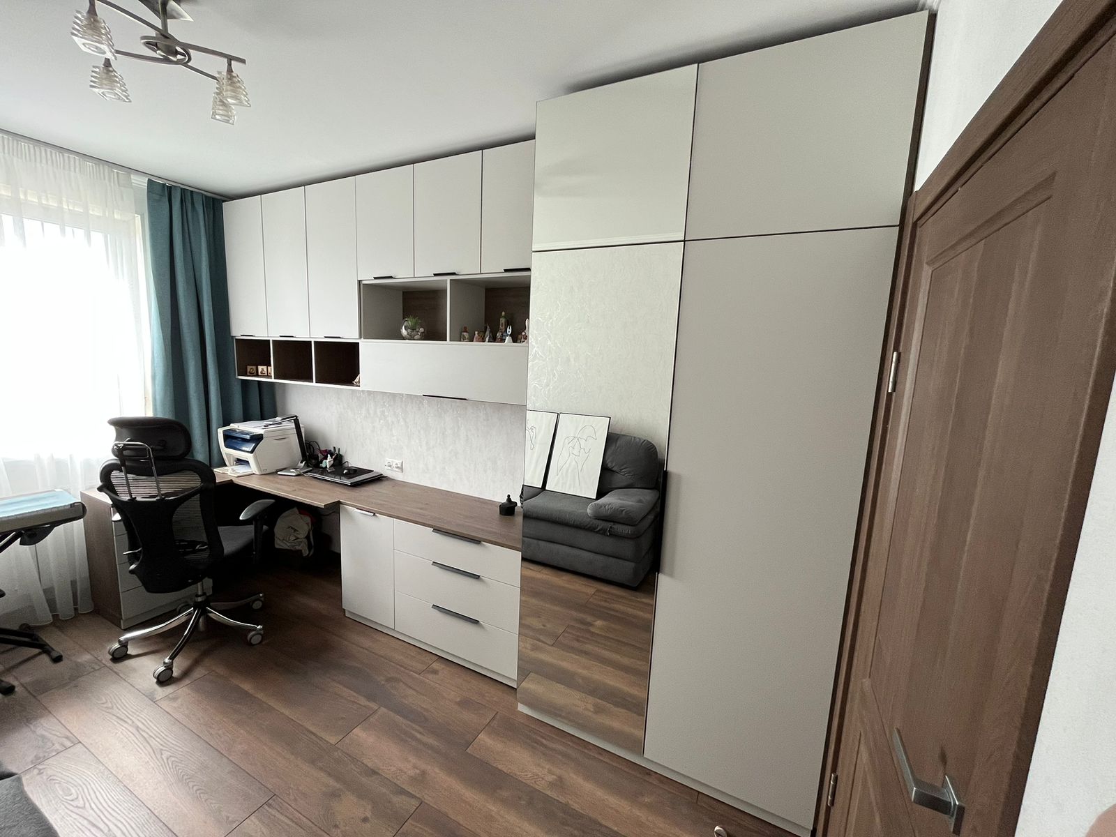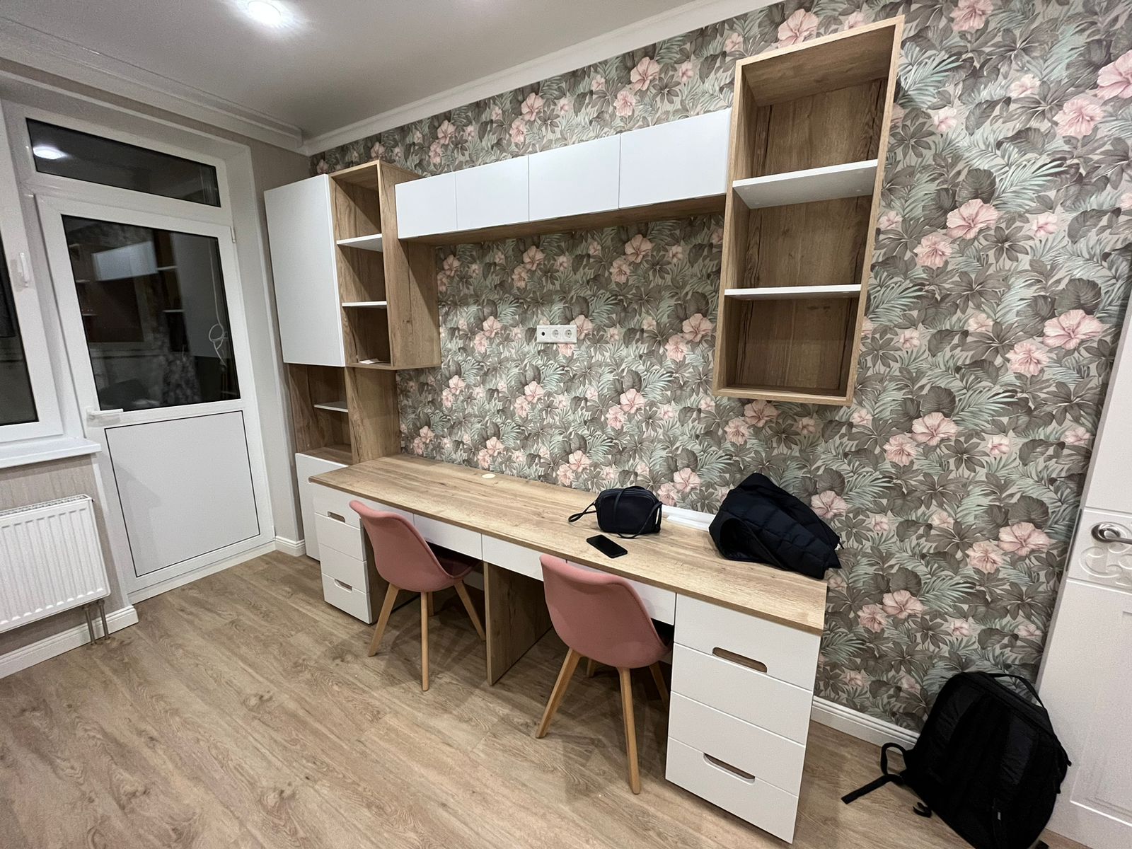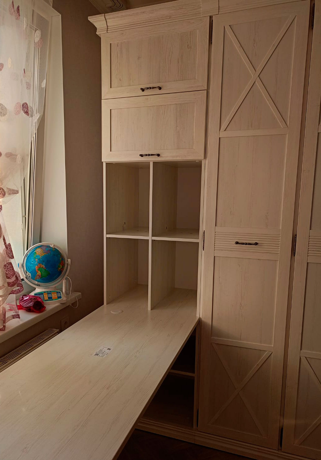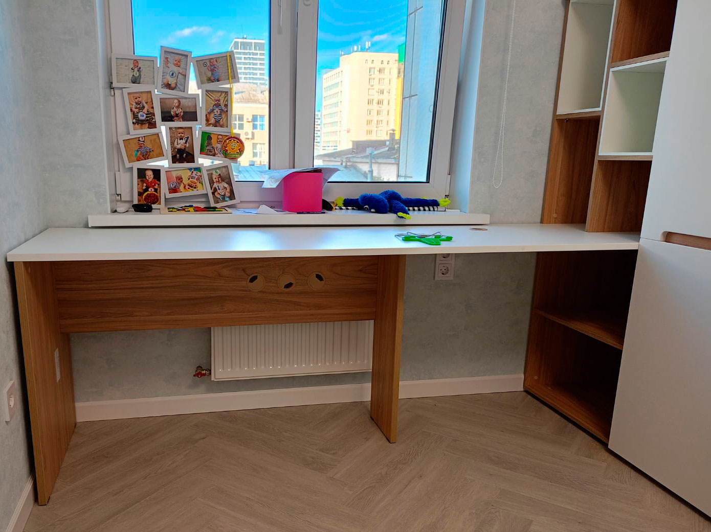 Детская: Одна просторная детская комната с двумя большими шкафами до потолка и встроенным рабочим столом для двоих детей. Шкафы выполнены с эмалевым покрытием глубокого цвета.