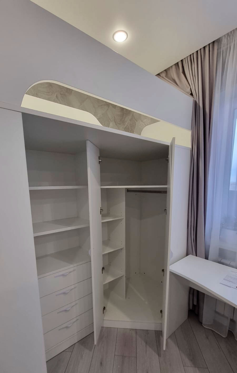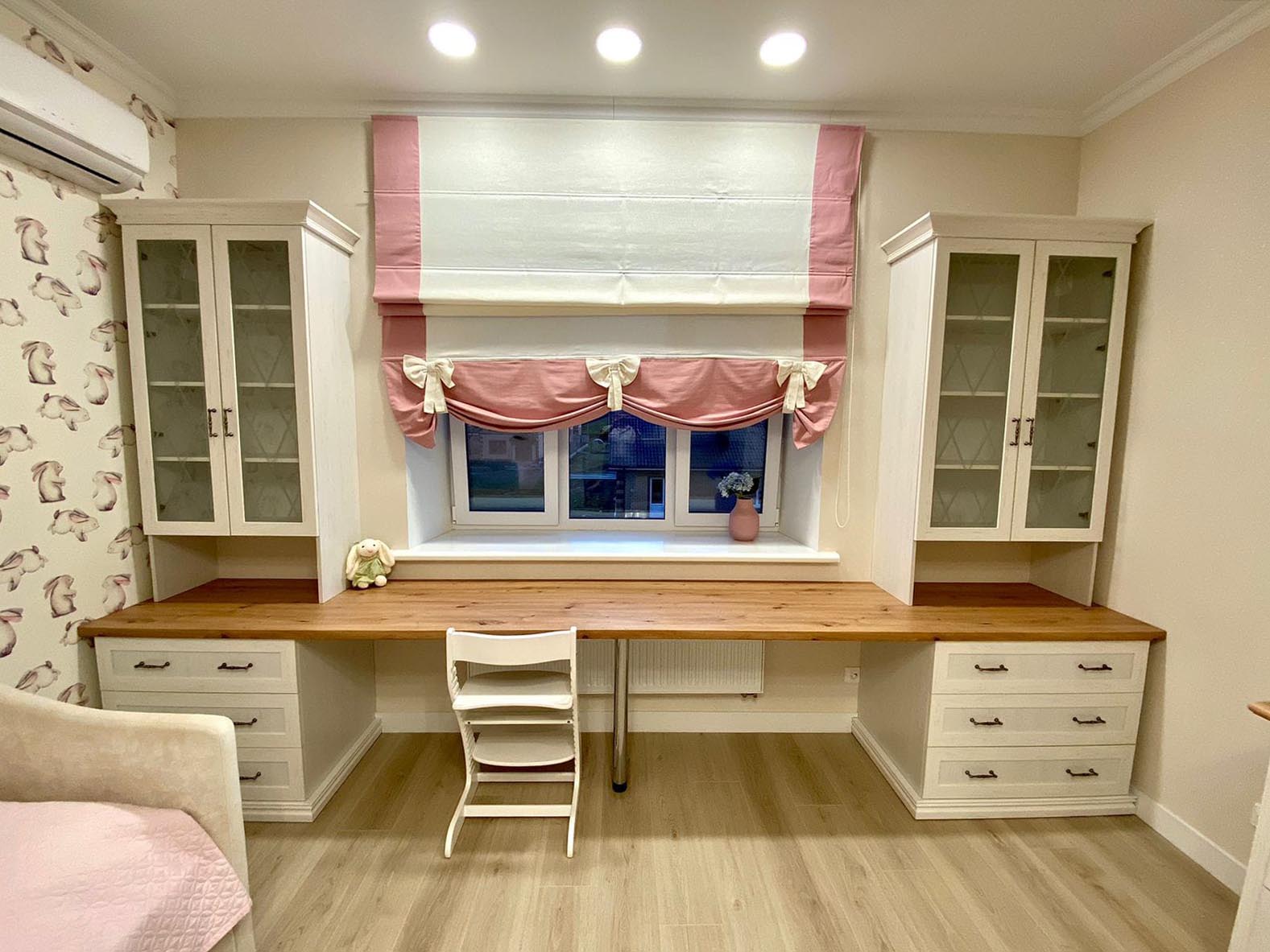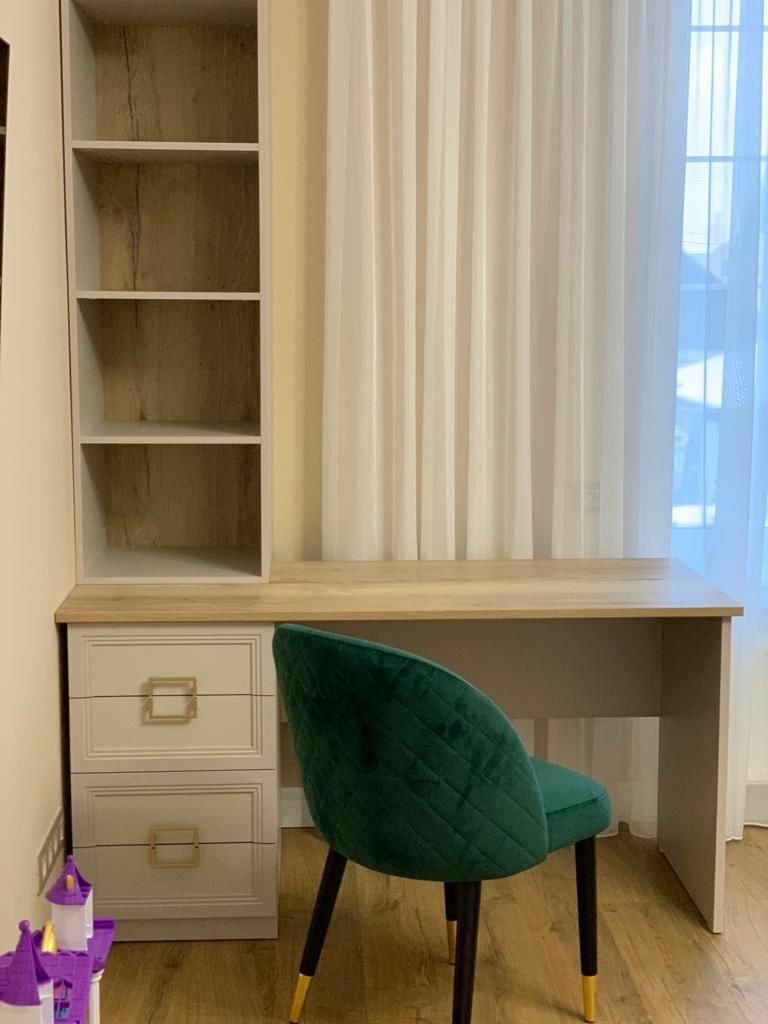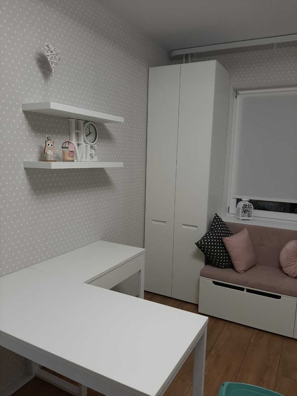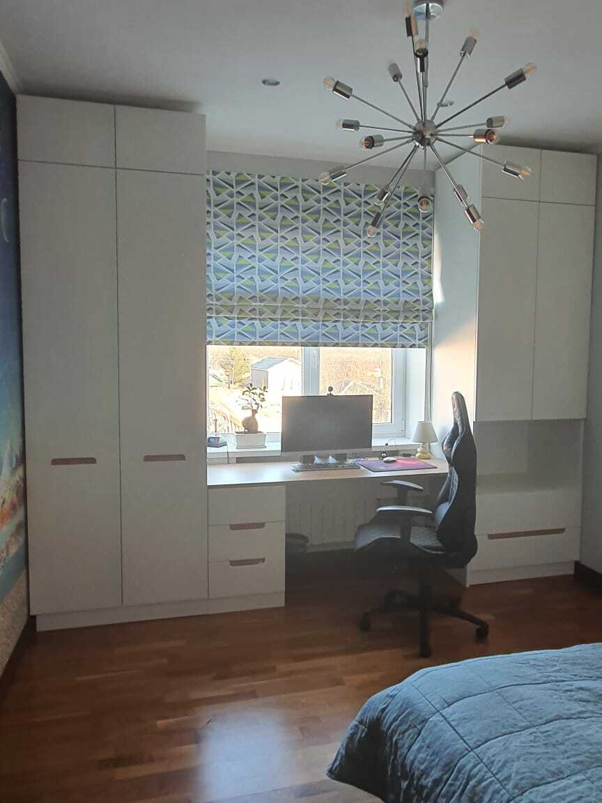 Детская: Одна просторная детская комната с двумя большими шкафами до потолка и встроенным рабочим столом для двоих детей. Шкафы выполнены с эмалевым покрытием глубокого цвета.