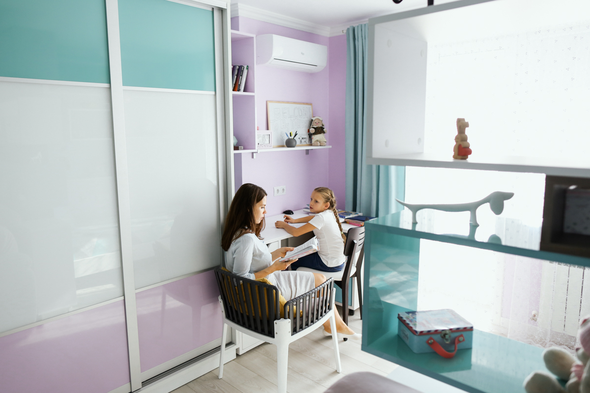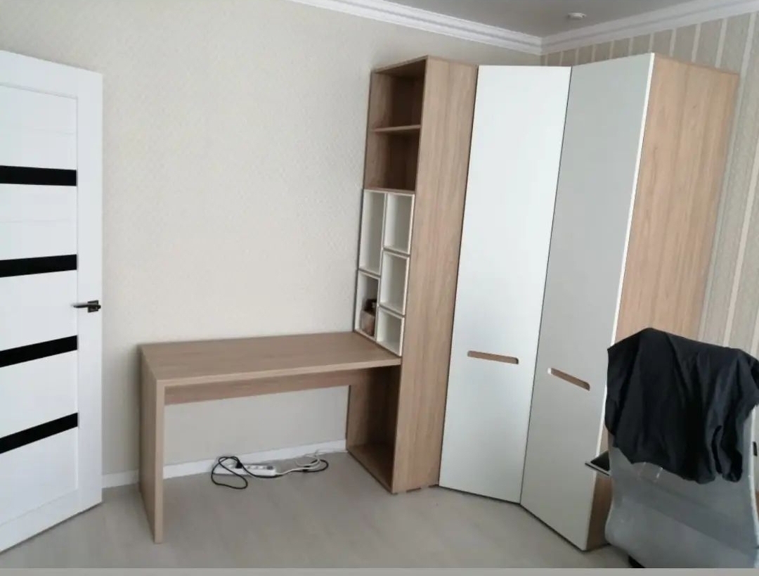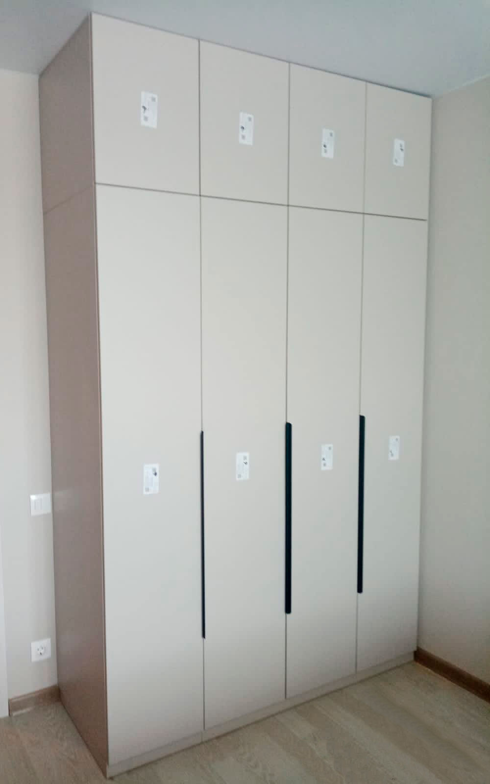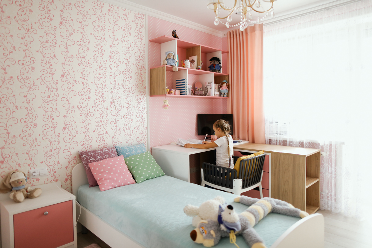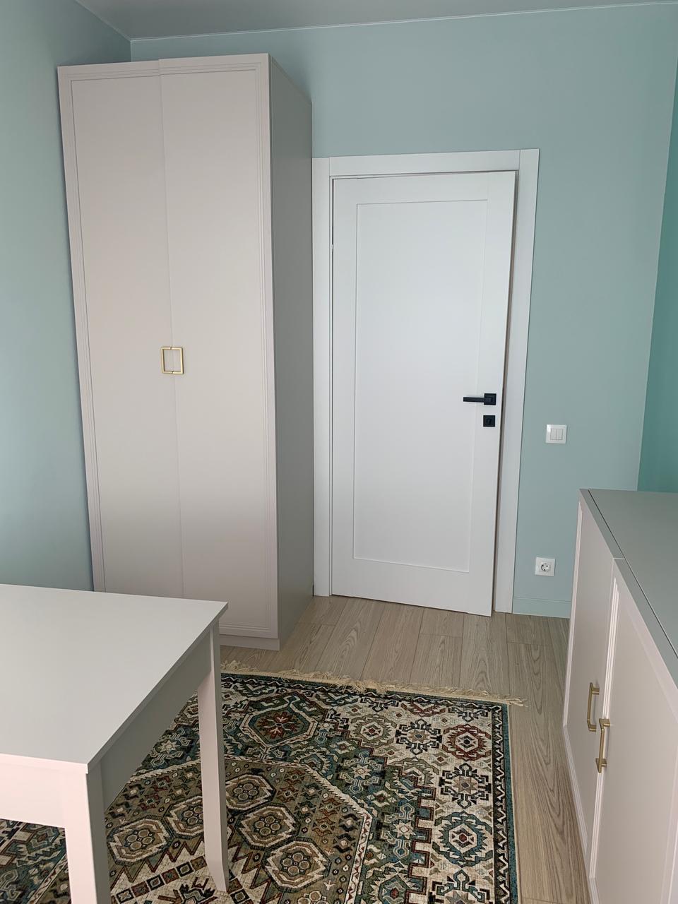 Детская: Одна просторная детская комната с двумя большими шкафами до потолка и встроенным рабочим столом для двоих детей. Шкафы выполнены с эмалевым покрытием глубокого цвета.