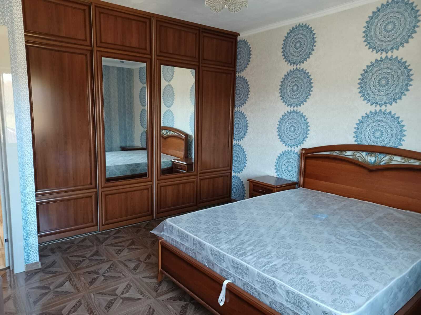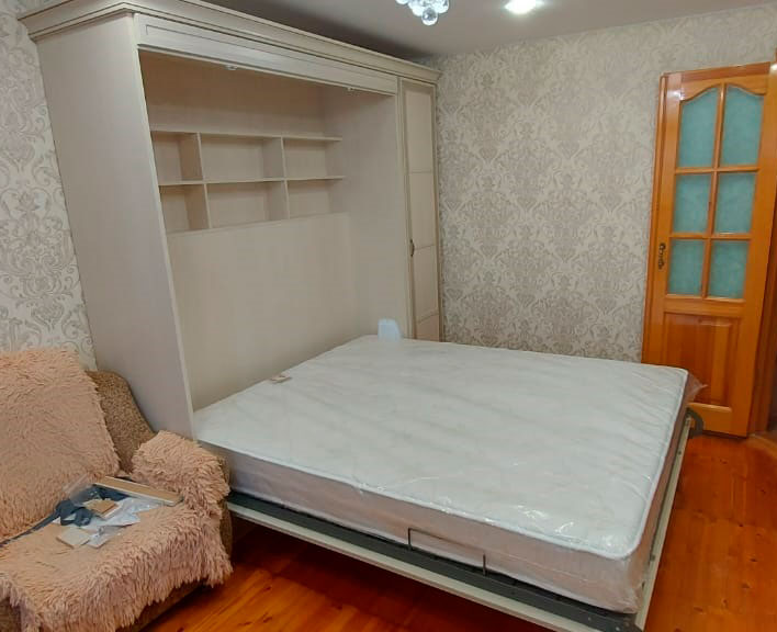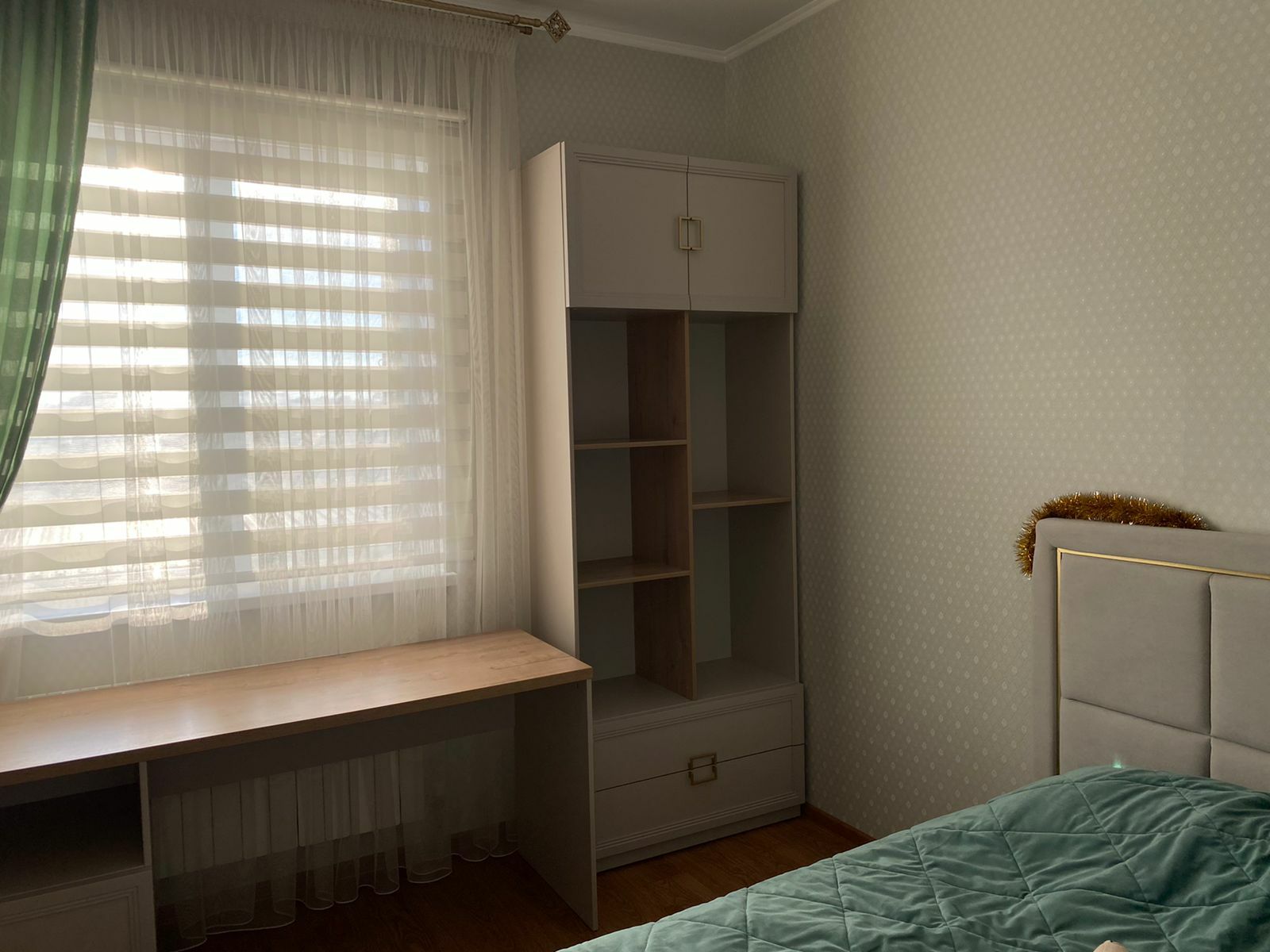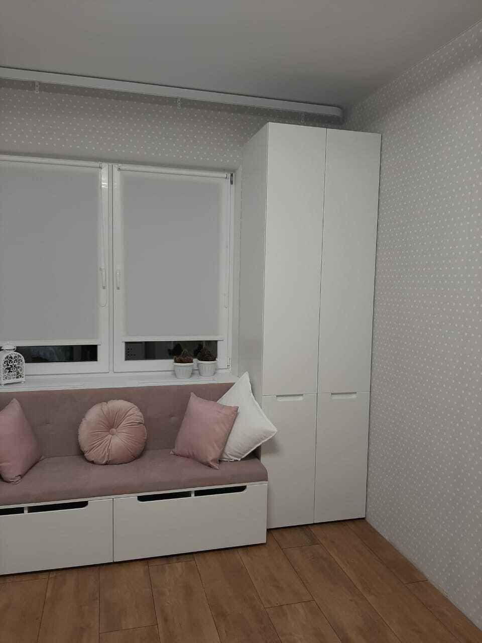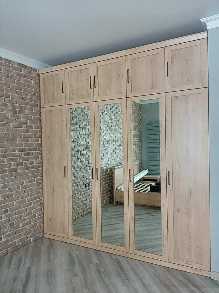 Детская: Одна просторная детская комната с двумя большими шкафами до потолка и встроенным рабочим столом для двоих детей. Шкафы выполнены с эмалевым покрытием глубокого цвета.