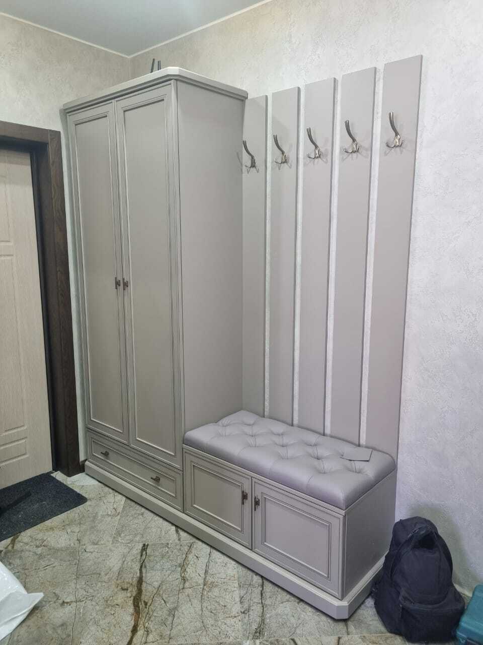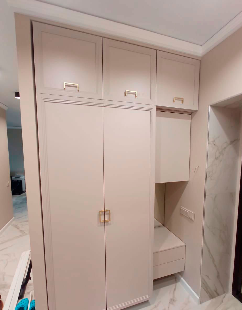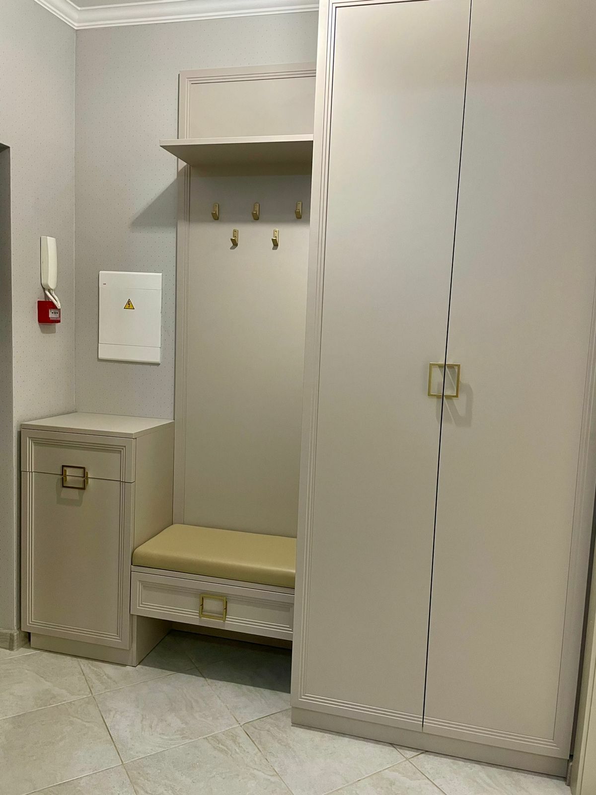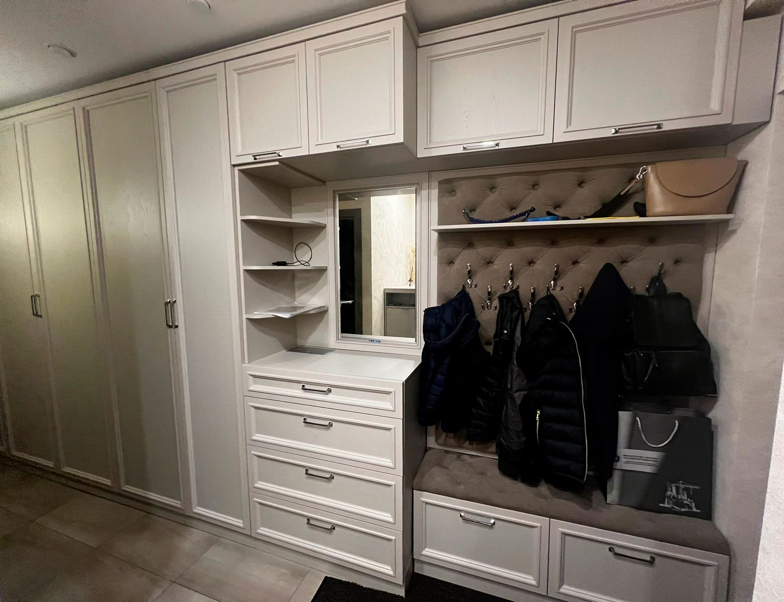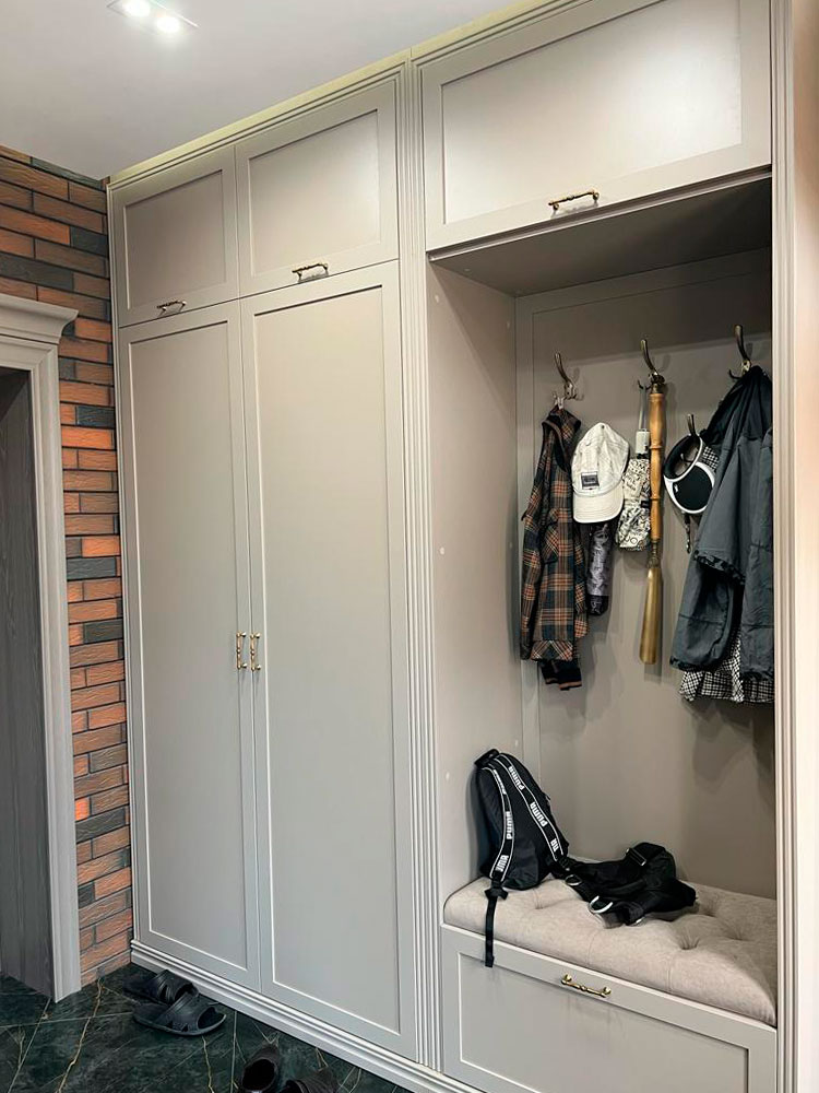 Вместе с клиентами мы разработали схемы будущей мебели, определили расположение ящиков, полок и крючков. Также подбирали материалы, цвета и фурнитуру, согласовывали детали, чтобы мебель гармонично вписалась в интерьер. Проводили замеры и проделали огромную работу. Производство осуществлялось на нашей фабрике «Ангстрем». Все было изготовлено в срок, доставлено и собрано до Нового года, что стало приятным сюрпризом для клиентов.