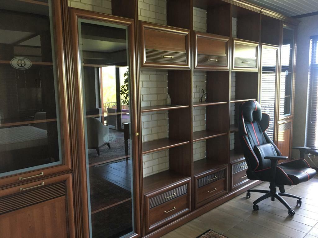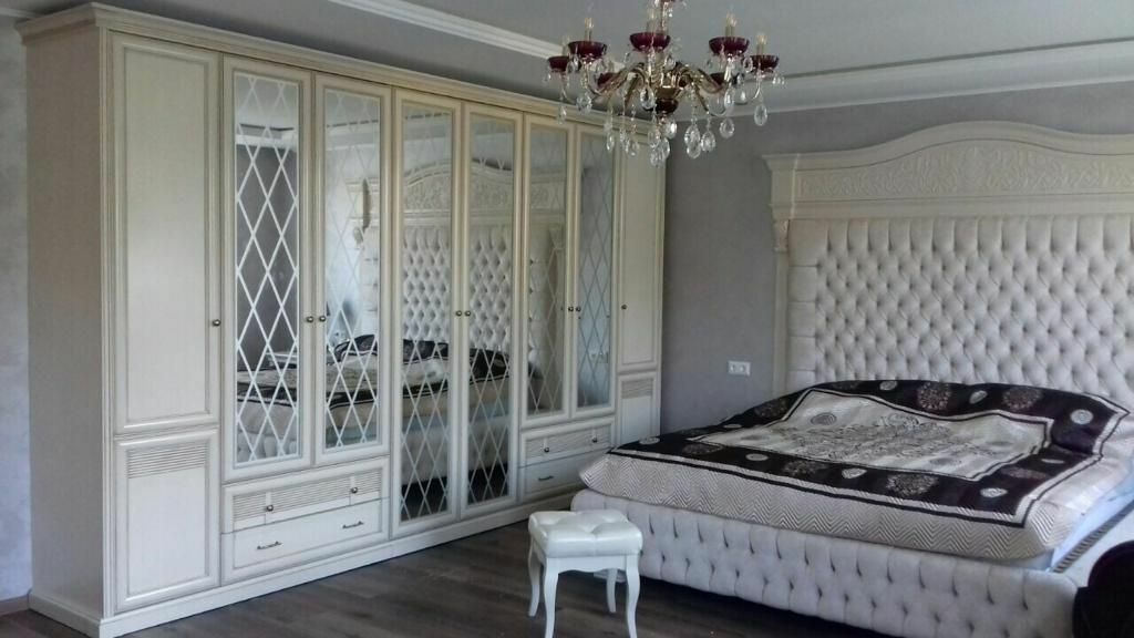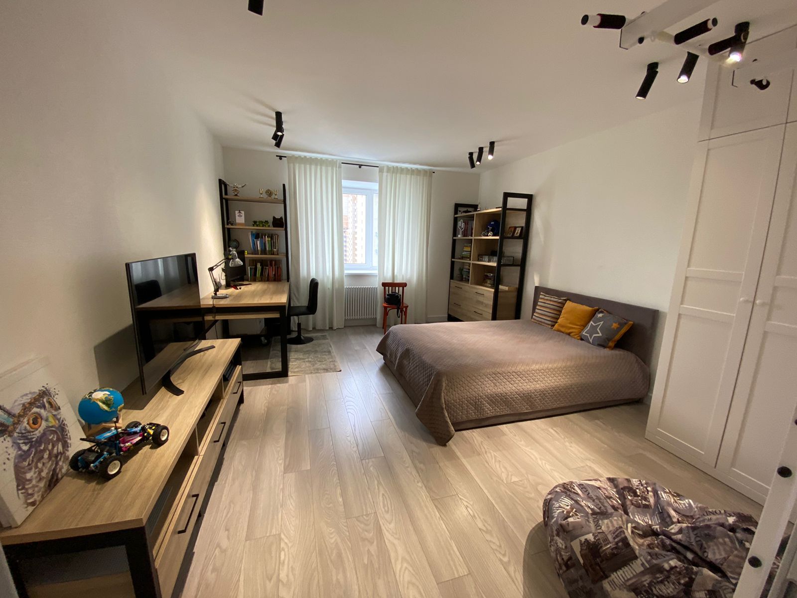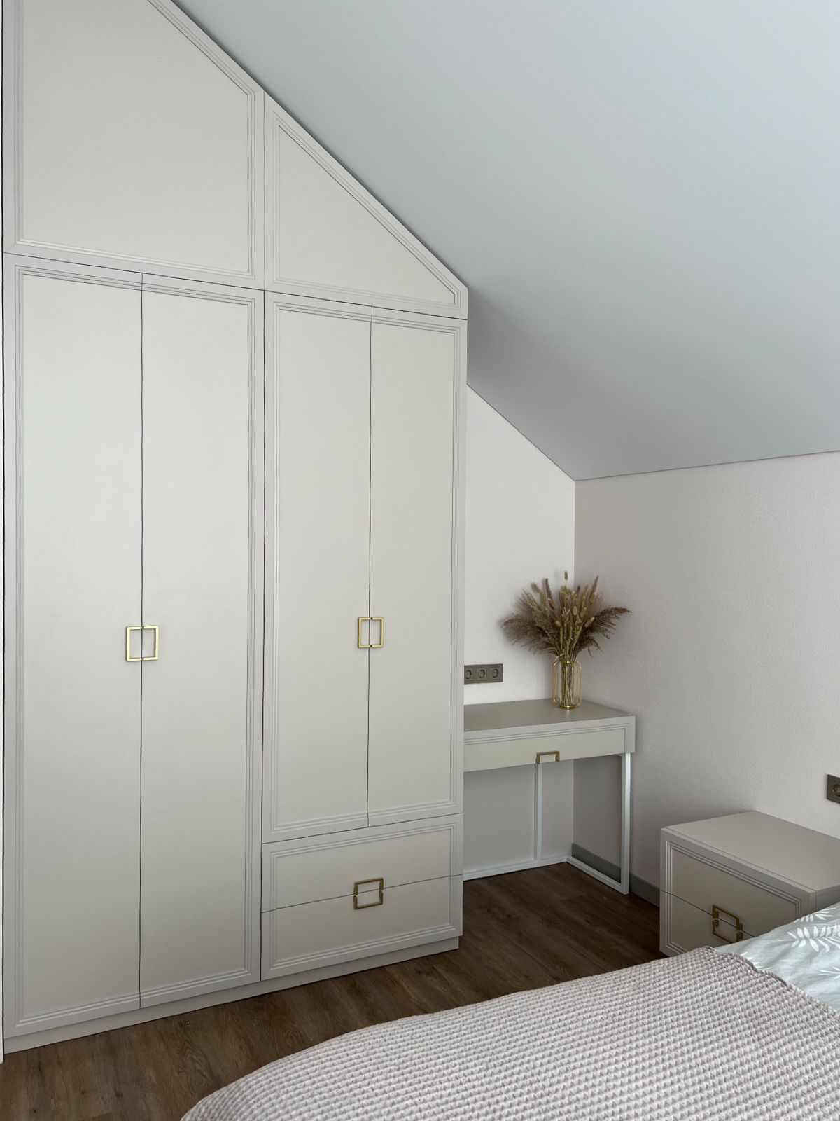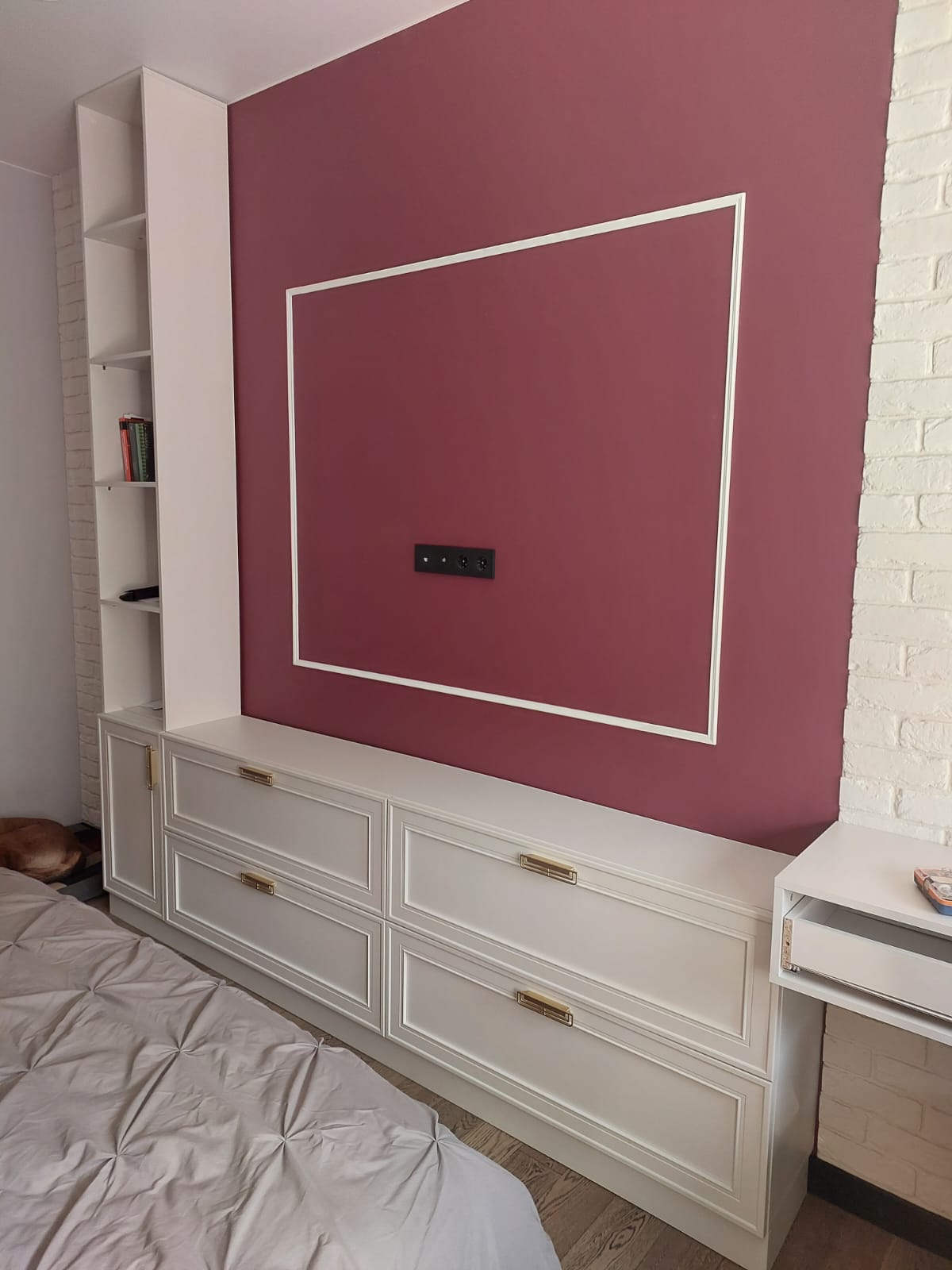 Спальня родителей: Спальня оборудована встроенной гардеробной системой Arista с купе-дверями (фасады – авторская работа с фрезеровкой). В спальне также находится рабочее место со встроенной навесной тумбой под телевизор.
