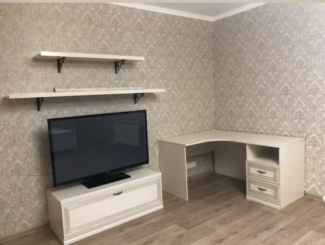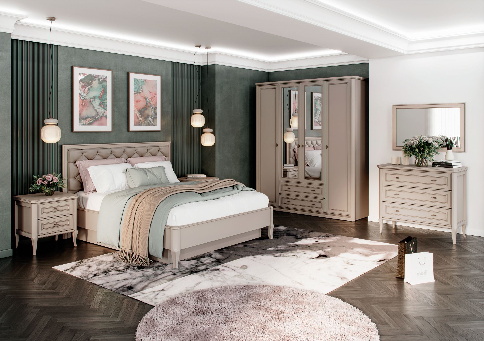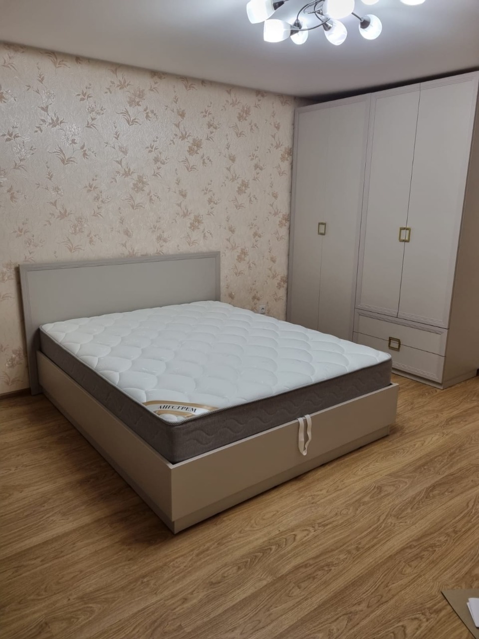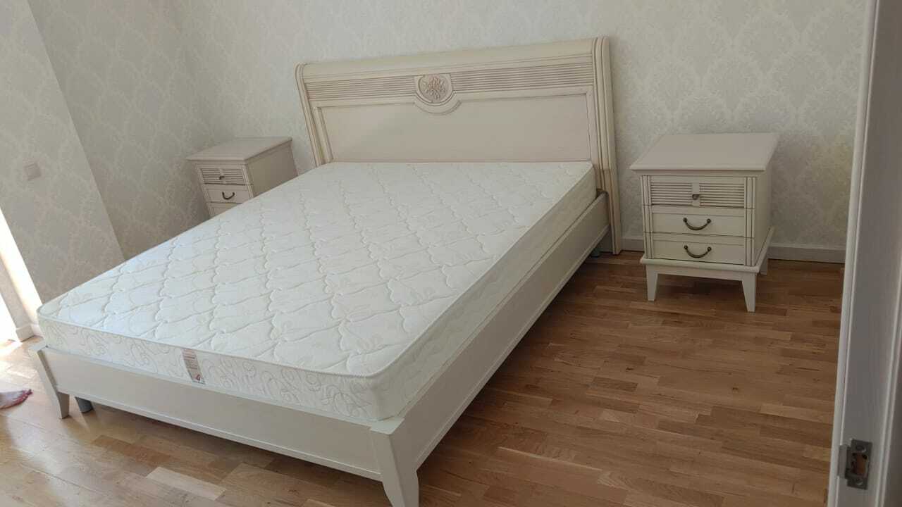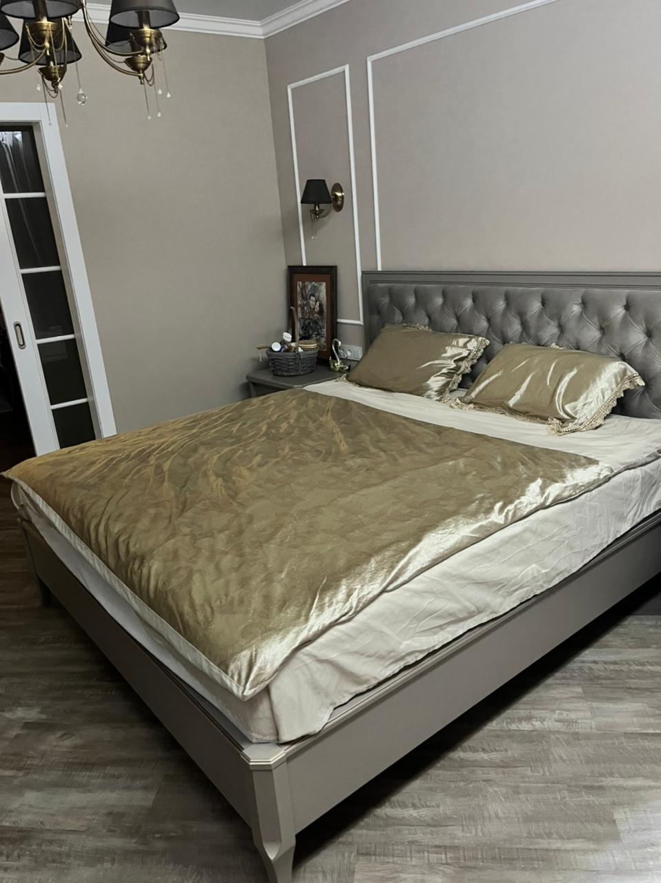 Спальня родителей: Спальня оборудована встроенной гардеробной системой Arista с купе-дверями (фасады – авторская работа с фрезеровкой). В спальне также находится рабочее место со встроенной навесной тумбой под телевизор.