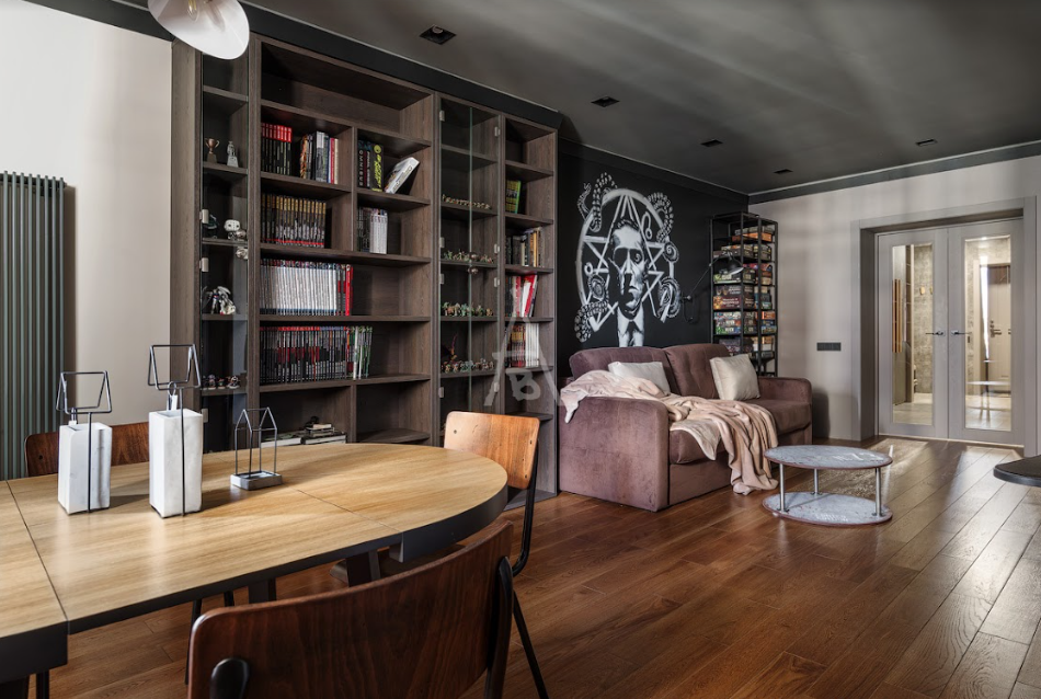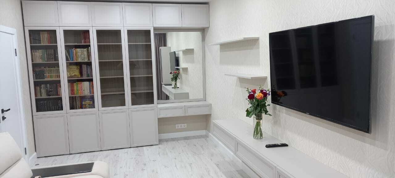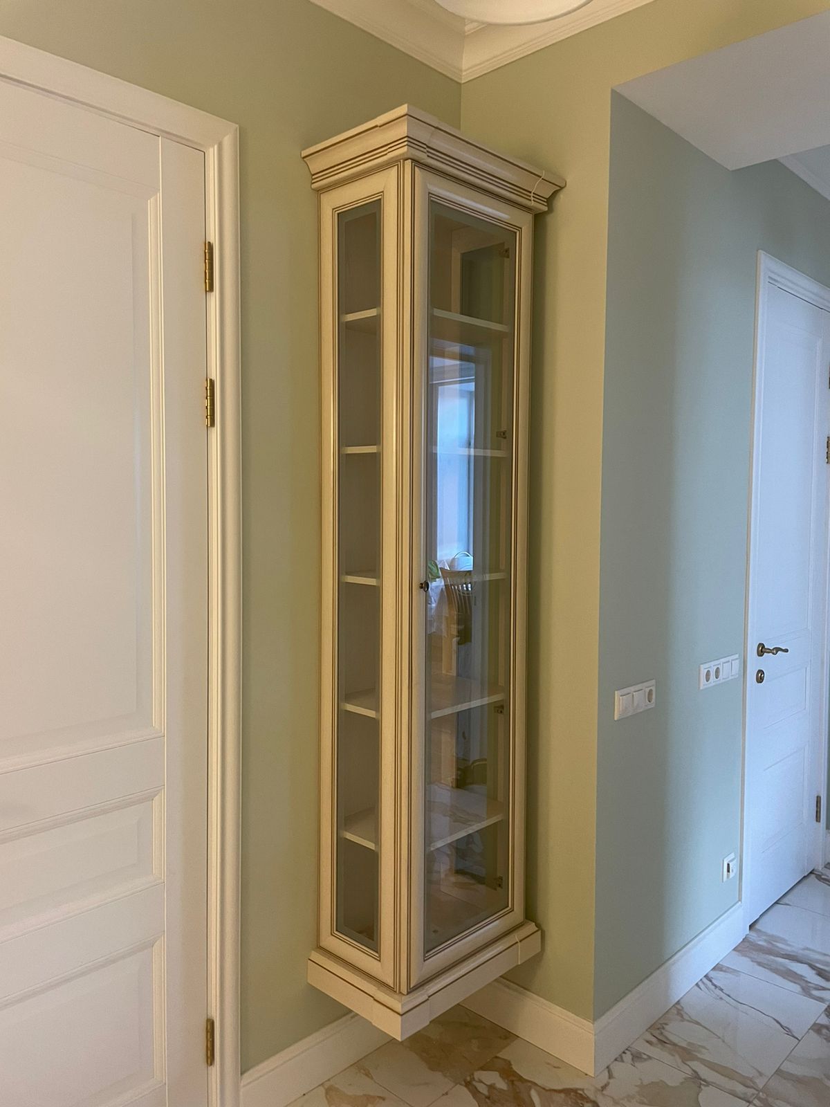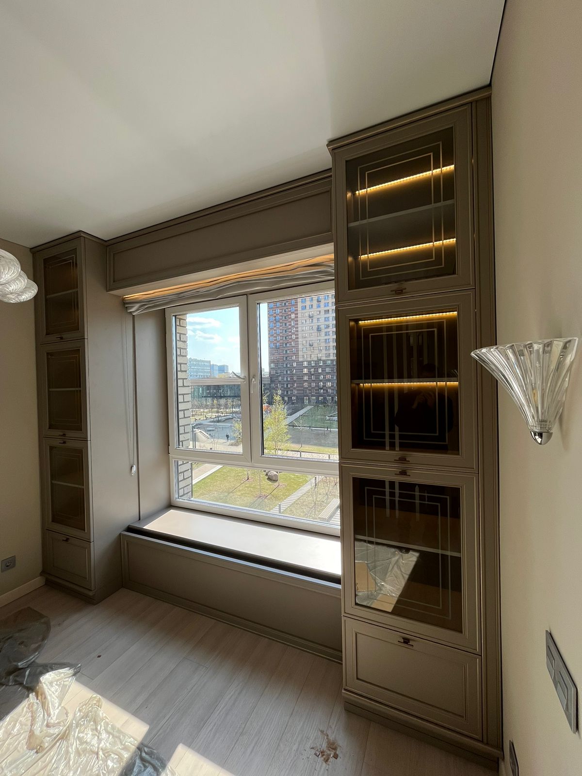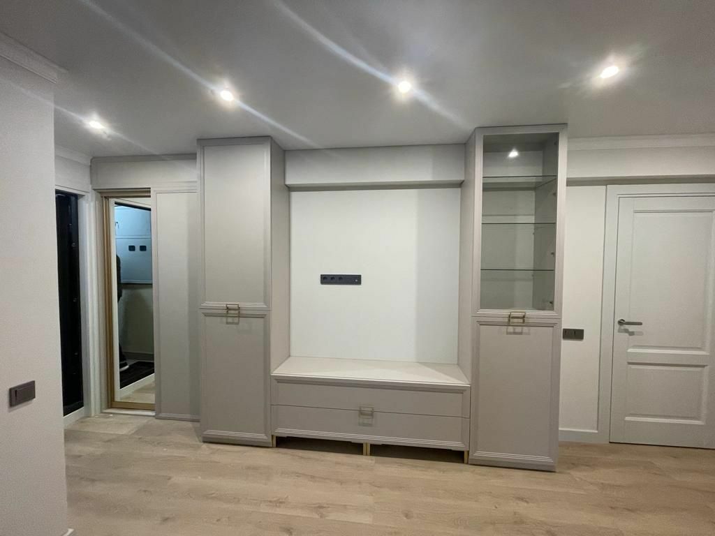 В гостиной, учитывая размеры и стиль, мы разработали витрины с изменяющейся высотой полок, создав иллюзию простора. Для тумбы был выбран фасад-купе, чтобы сохранить визуальную линию с витринами и шкафами. Дизайн учитывал наличие яркой, авангардной посуды и часов клиента.