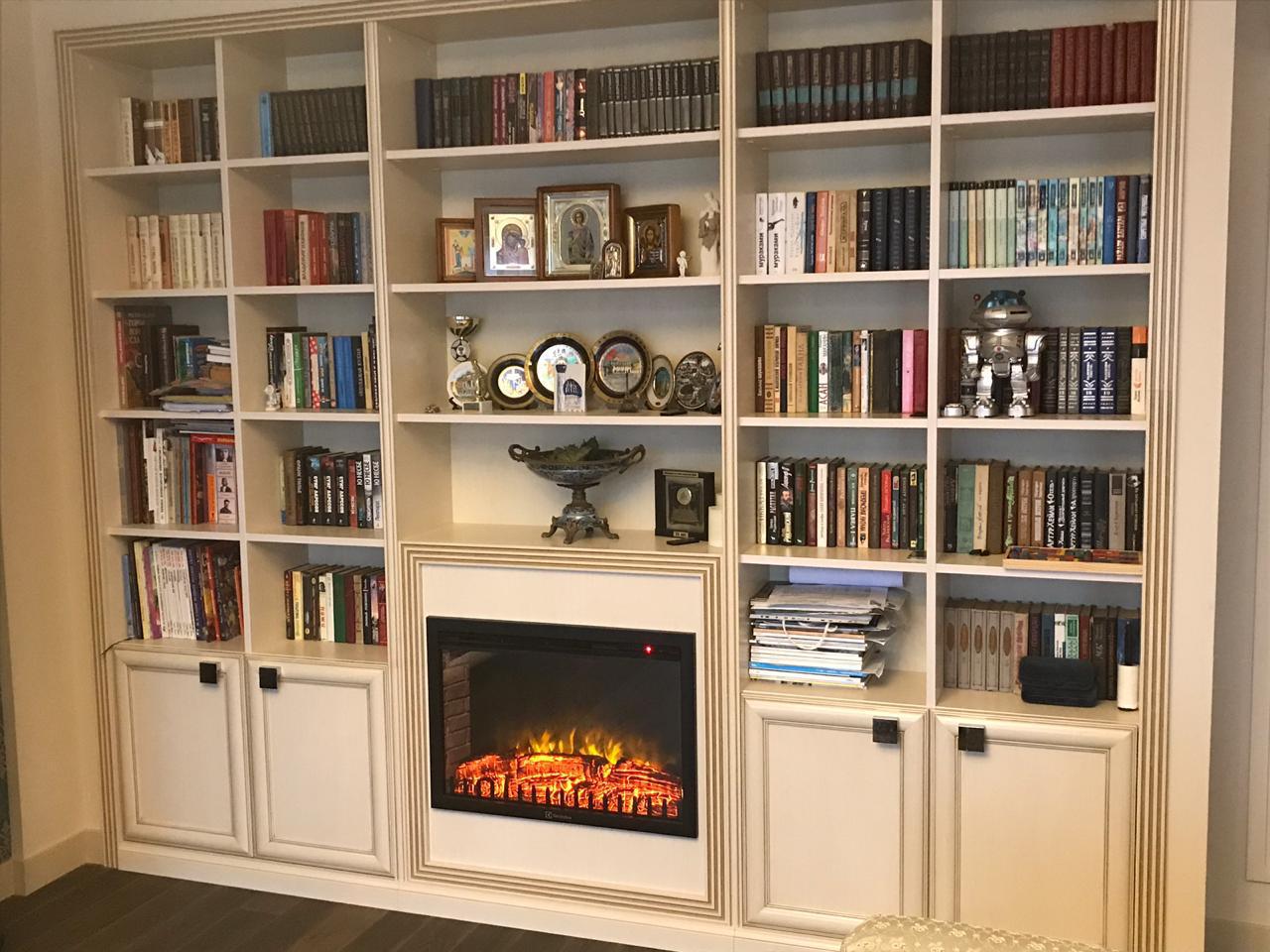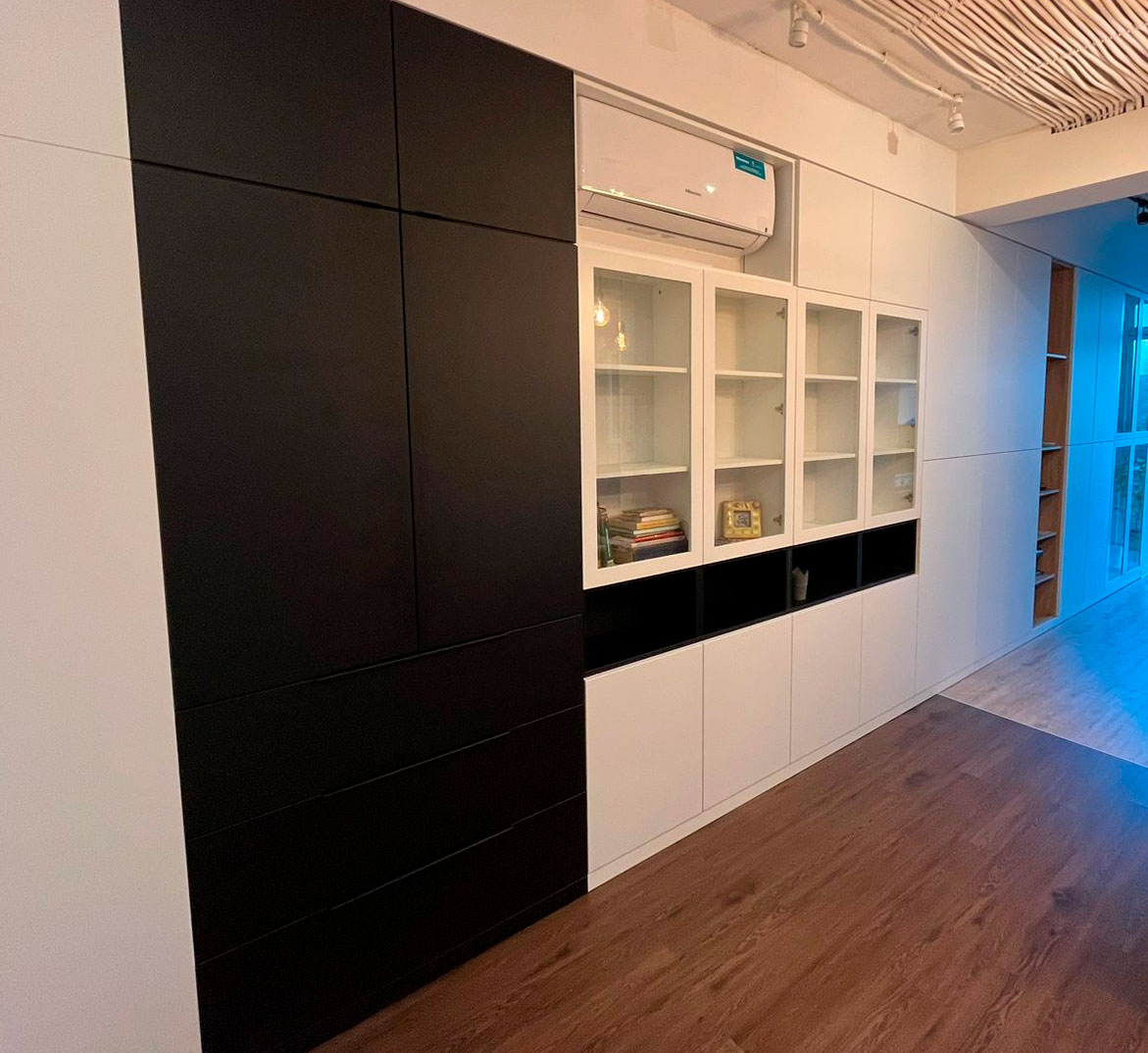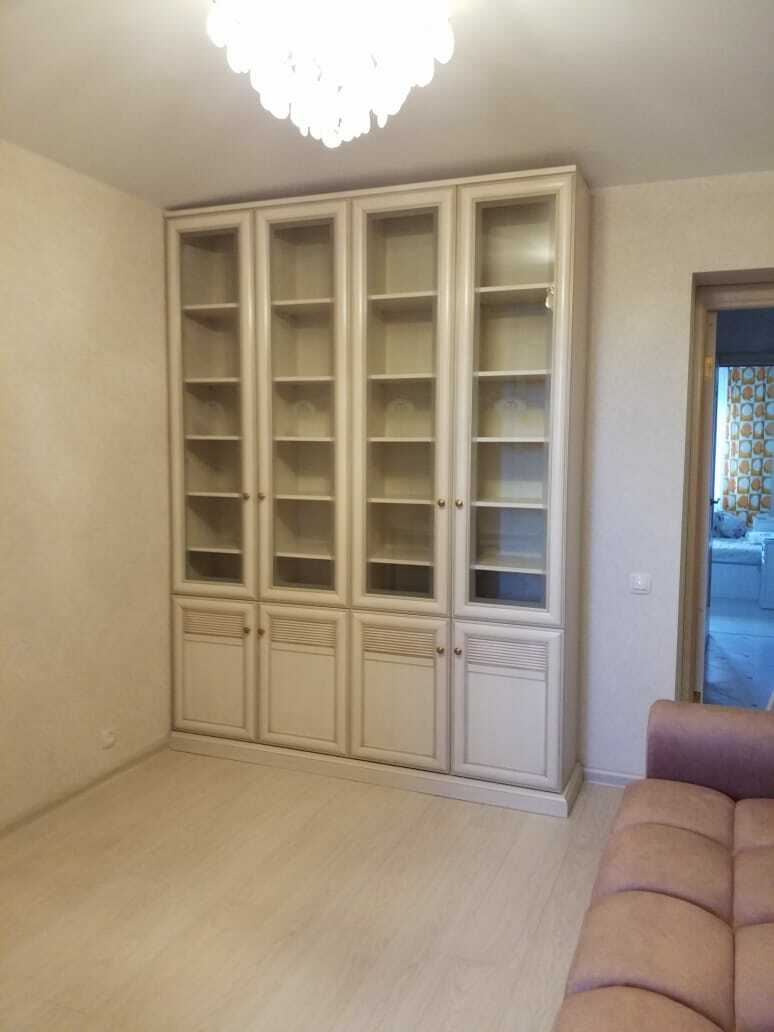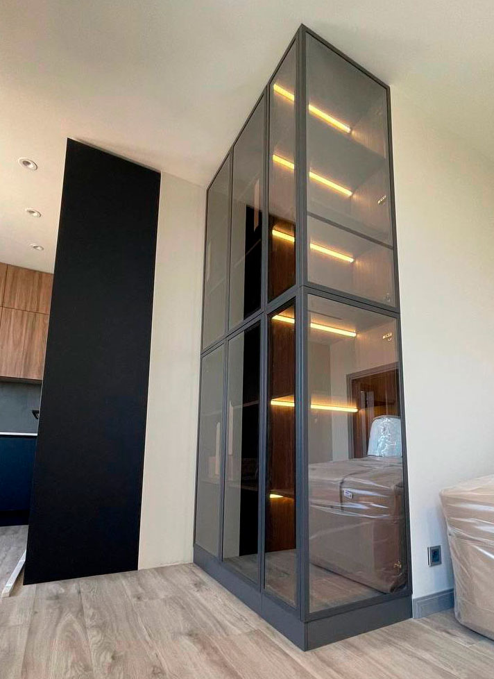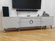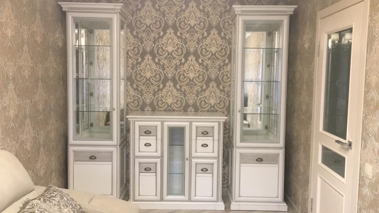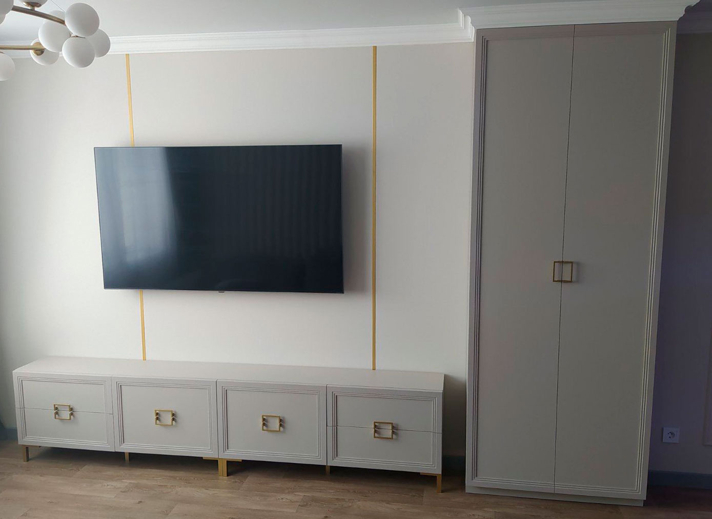В гостиной, учитывая размеры и стиль, мы разработали витрины с изменяющейся высотой полок, создав иллюзию простора. Для тумбы был выбран фасад-купе, чтобы сохранить визуальную линию с витринами и шкафами. Дизайн учитывал наличие яркой, авангардной посуды и часов клиента.