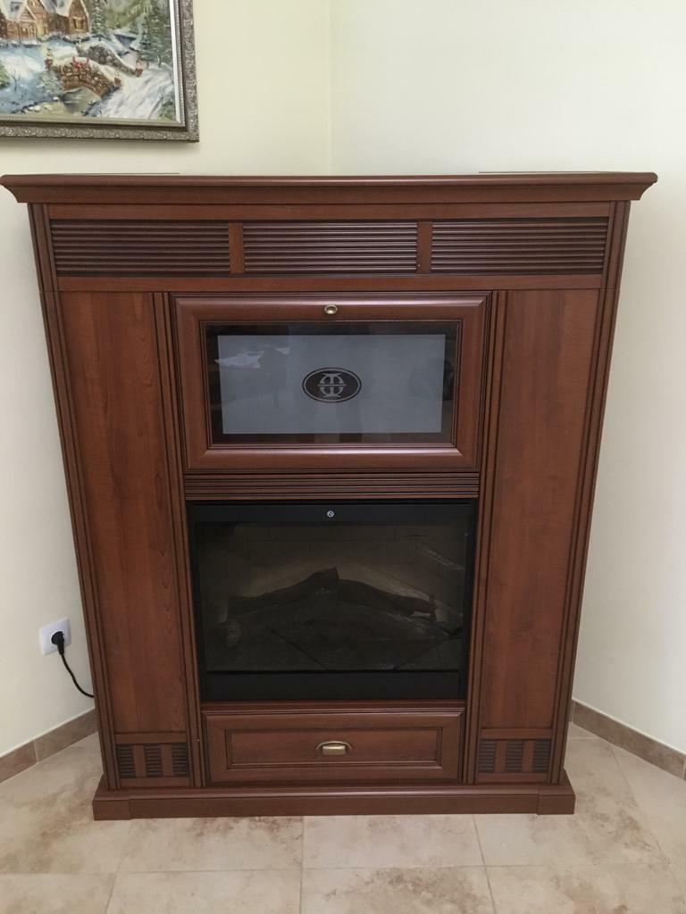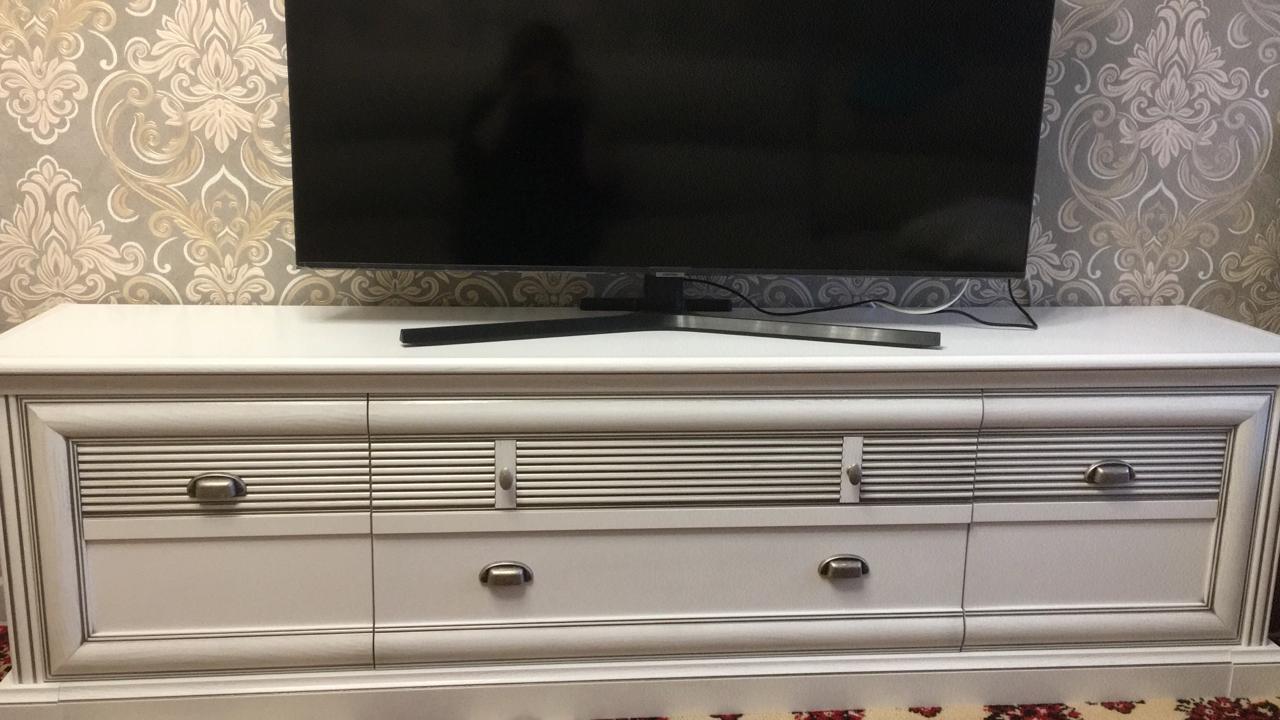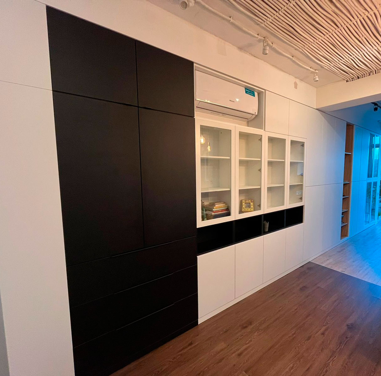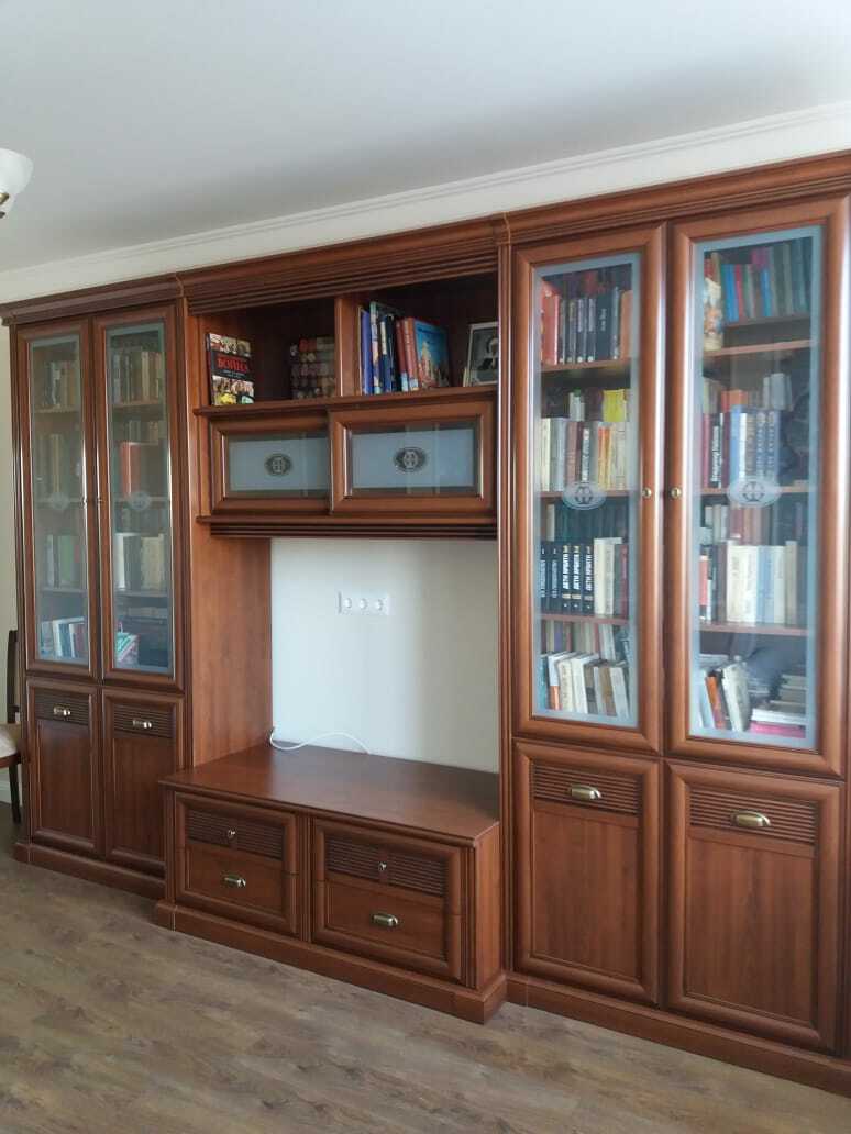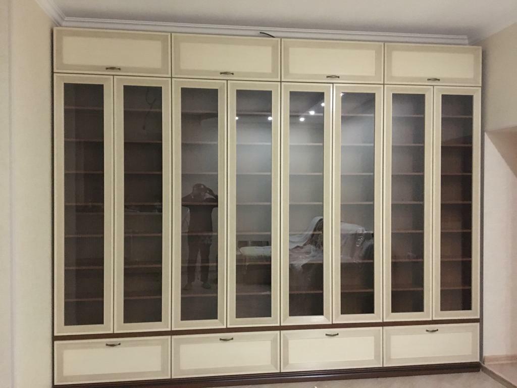 В гостиной, учитывая размеры и стиль, мы разработали витрины с изменяющейся высотой полок, создав иллюзию простора. Для тумбы был выбран фасад-купе, чтобы сохранить визуальную линию с витринами и шкафами. Дизайн учитывал наличие яркой, авангардной посуды и часов клиента.
