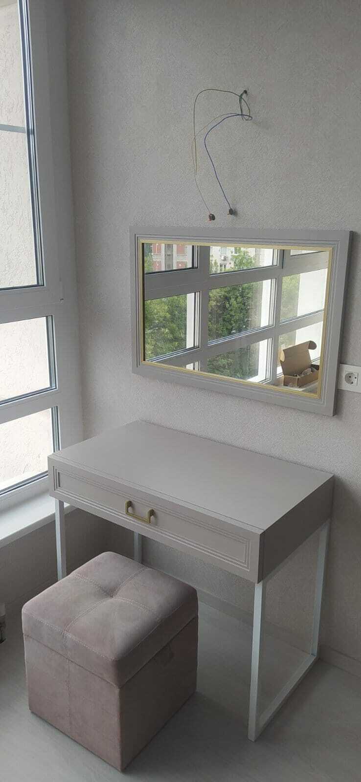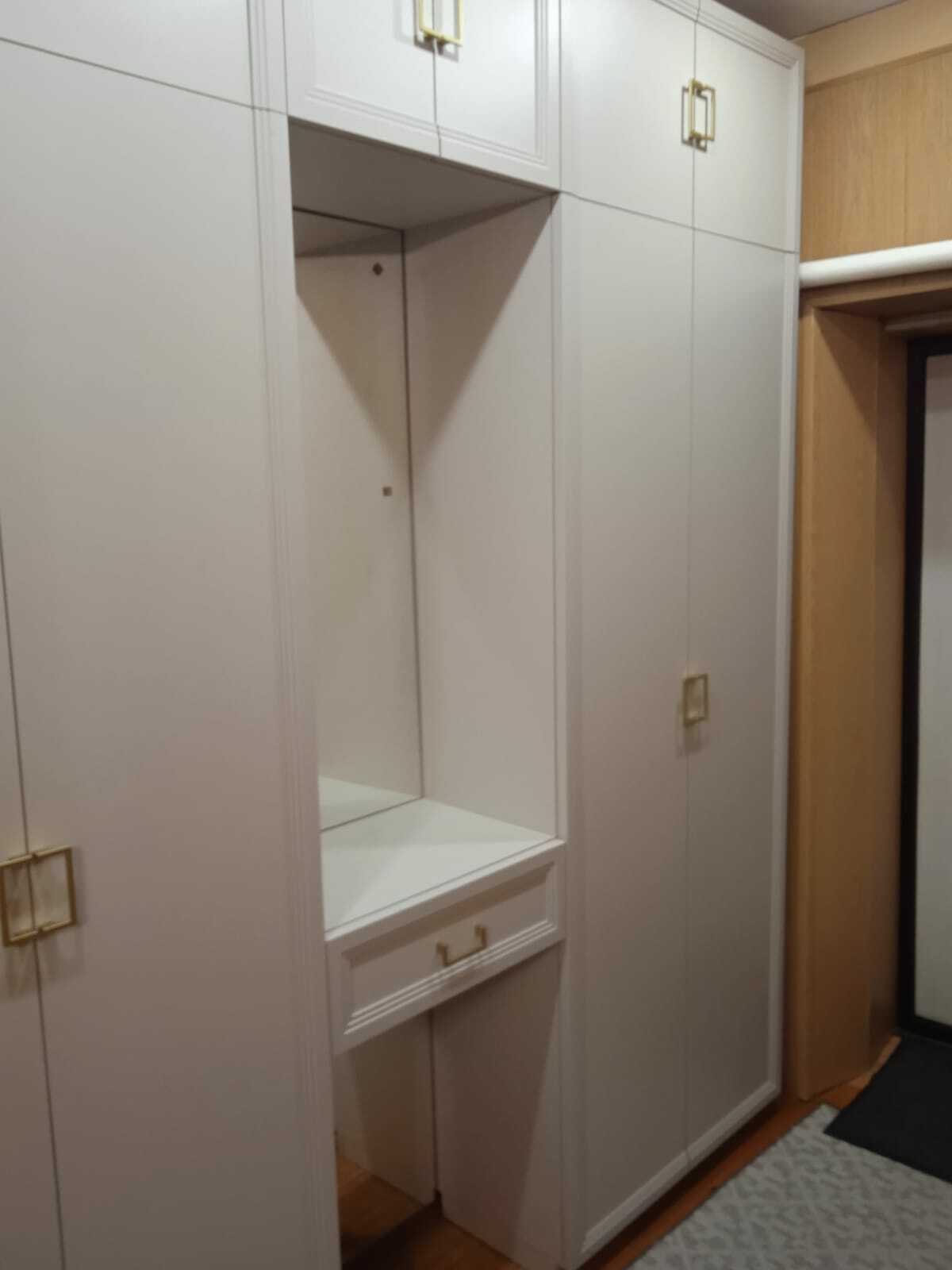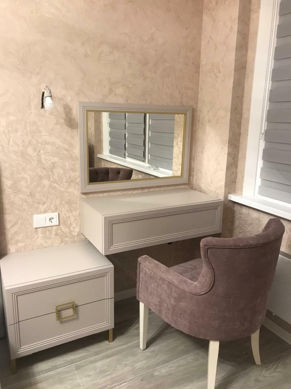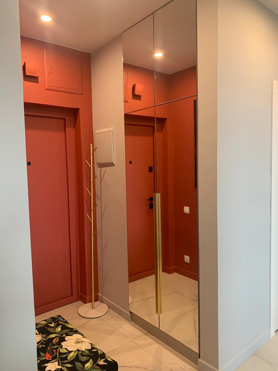 В прихожей, учитывая её узкую форму, мы спроектировали шкаф-купе, дополнив его подвесной консолью с зеркалом для хранения мелочей. Создали также зону для переодевания, отсутствовавшую на момент первого осмотра.