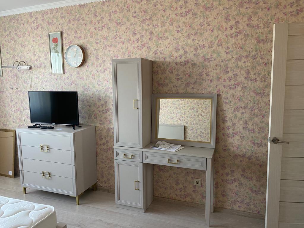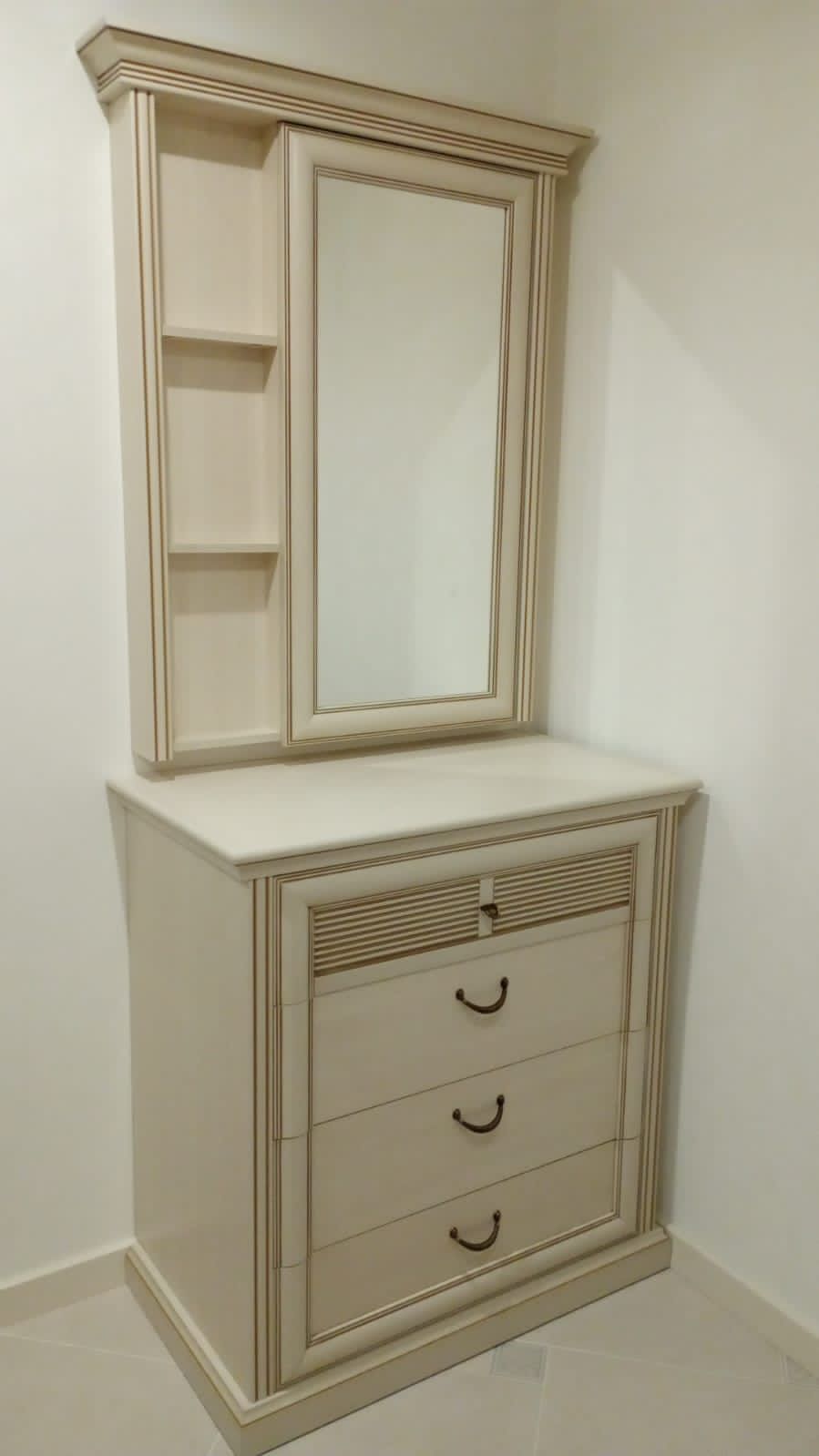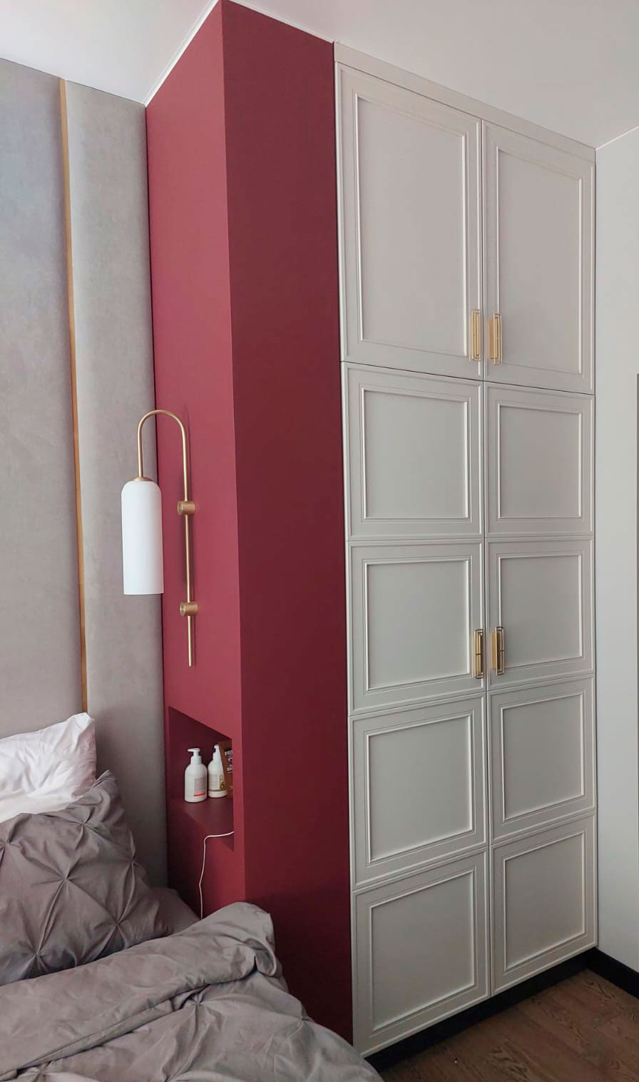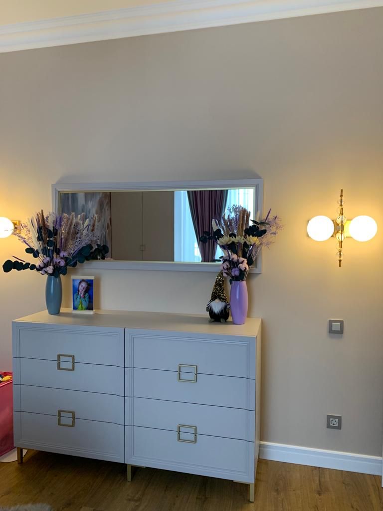 В прихожей, учитывая её узкую форму, мы спроектировали шкаф-купе, дополнив его подвесной консолью с зеркалом для хранения мелочей. Создали также зону для переодевания, отсутствовавшую на момент первого осмотра.