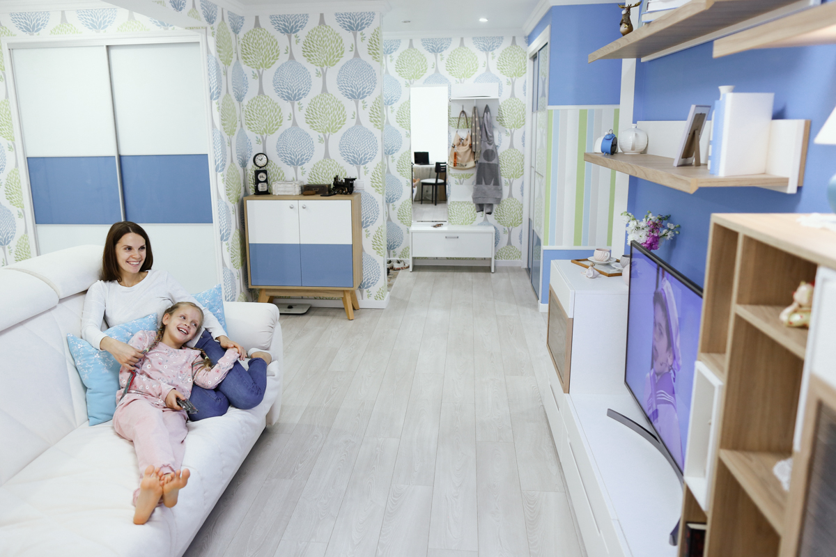 Несмотря на небольшую площадь квартиры, грамотно организованная система хранения позволила разместить все необходимые вещи для комфортного проживания всей семьи.