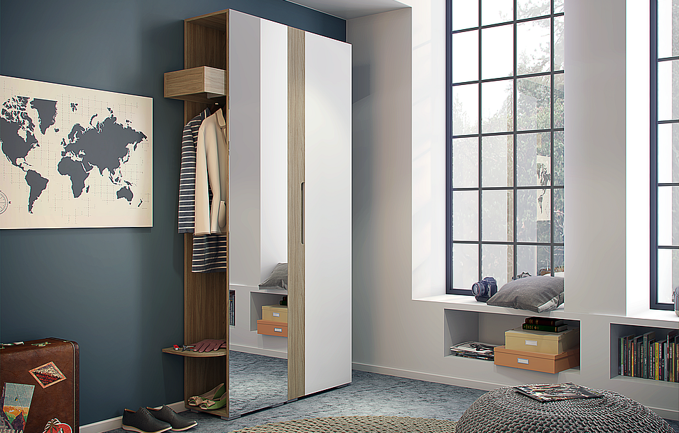 Комплект состоит из шкафа и стеллажа, изготовленных из ЛДСП и облицованной ПВХ-пленкой МДФ. Шкафной модуль включает две полки и отсек с евроштангой, наполнение может варьироваться в зависимости от потребностей пользователя. Дверные петли оснащены демпферами для более плавного движения.