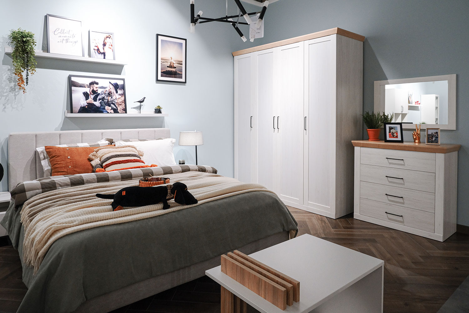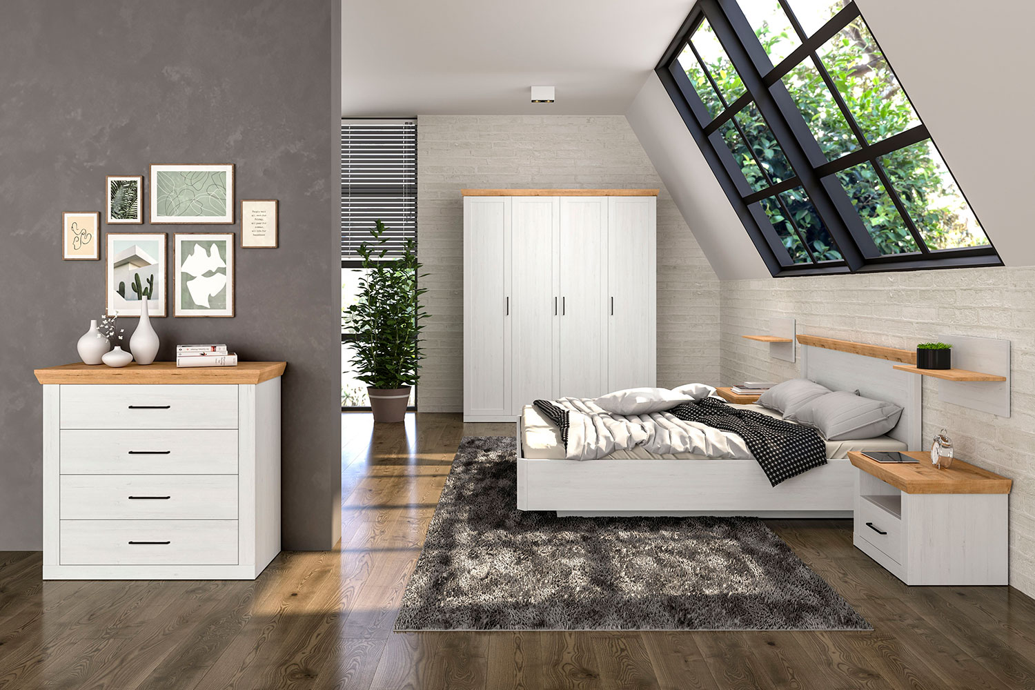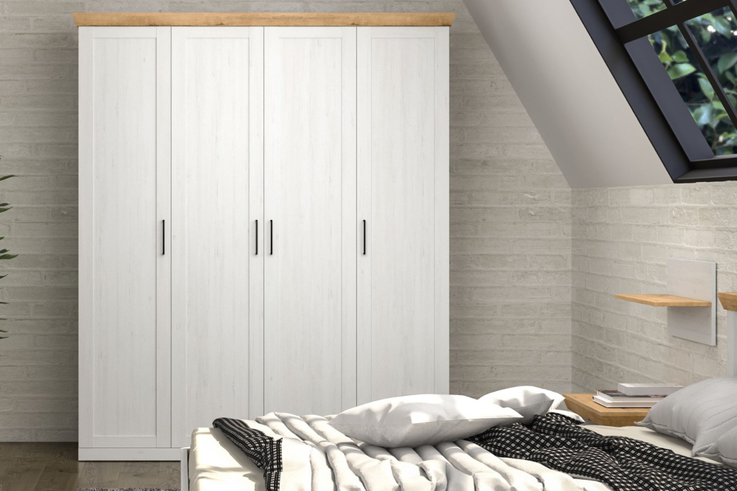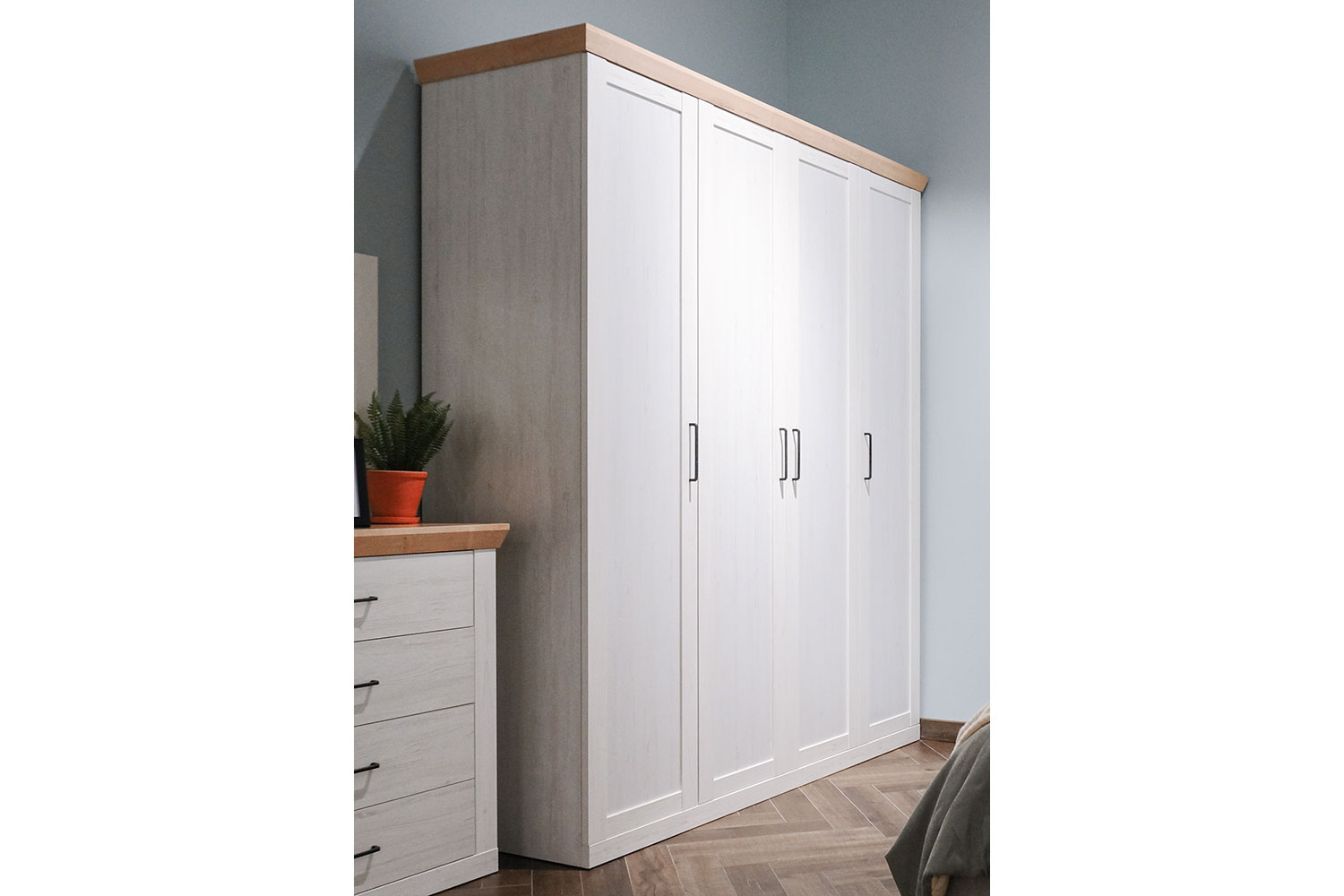 Вместительная модель с покрытием цвета «блан-шене» станет настоящим подарком для тех, кто давно мечтает о своей гардеробной. Платяной шкаф подойдет для минималистичной спальни или гостиной в современном оформлении. Изящный скошенный карниз в оттенке «дуб бунратти», лаконичные филенки и тонкие ручки-скобы, стилизованные под «античное железо черное», делают внешний облик мебели аккуратным и завершенным. Опорная часть замаскирована цоколем, выполненным в основном тоне.
