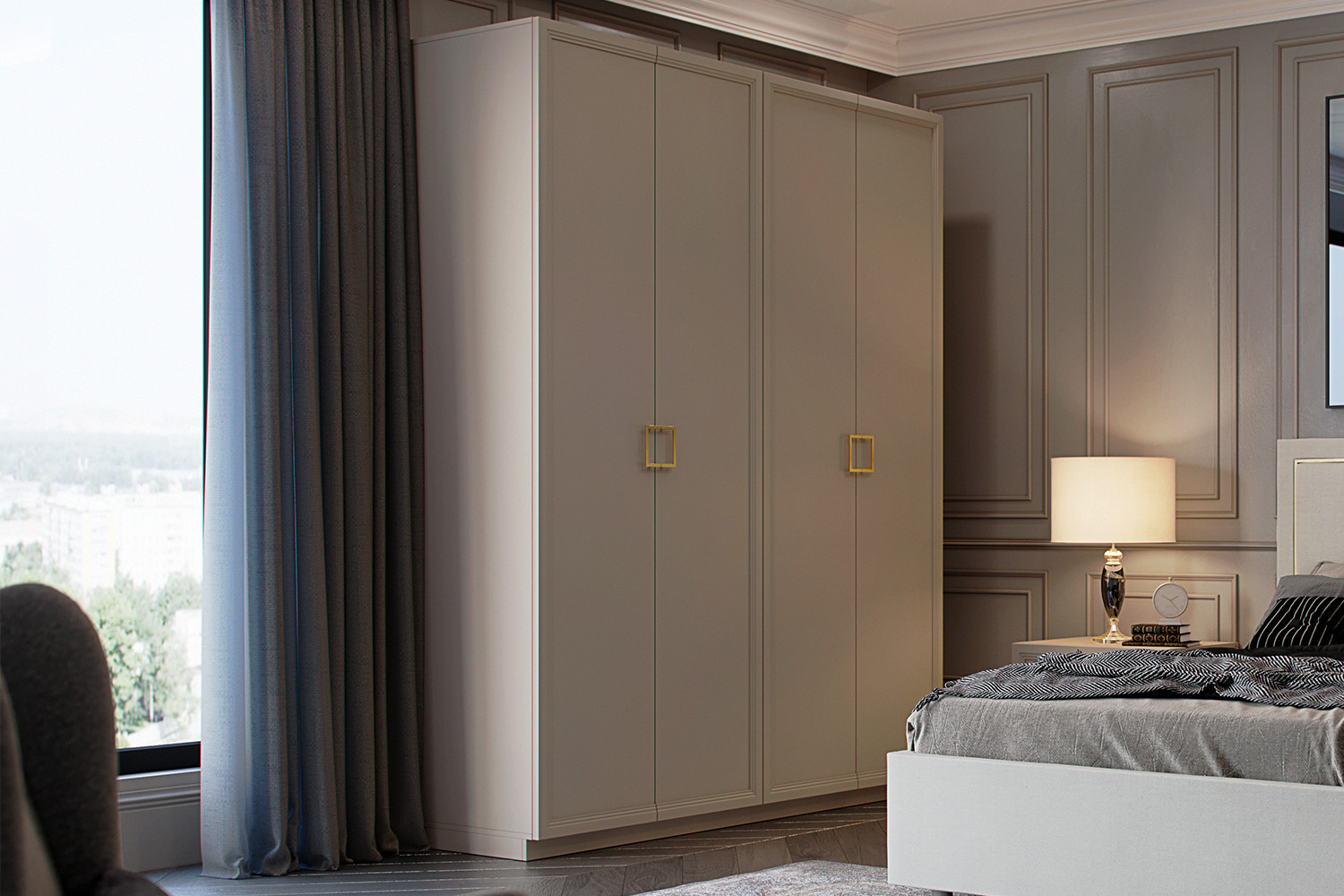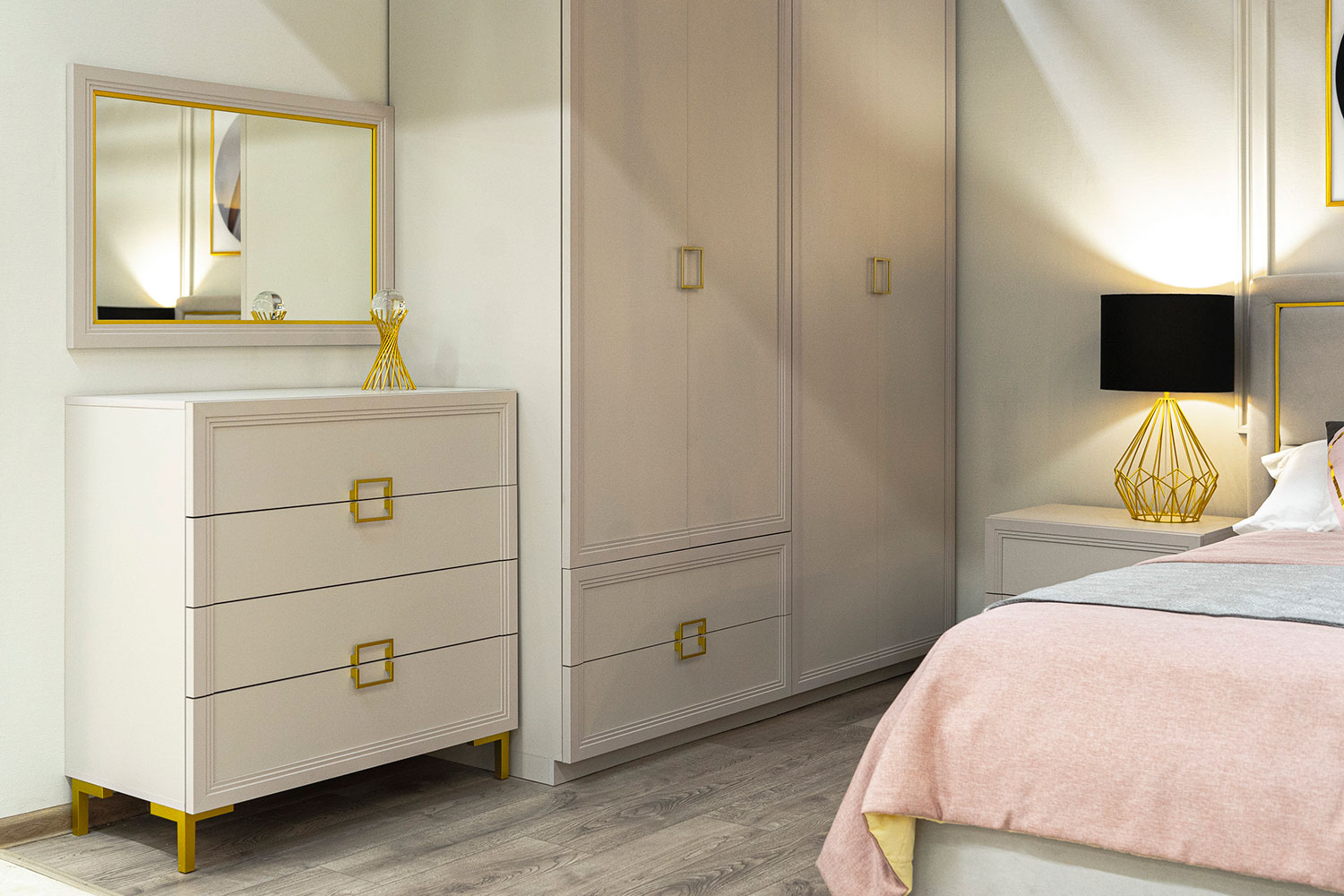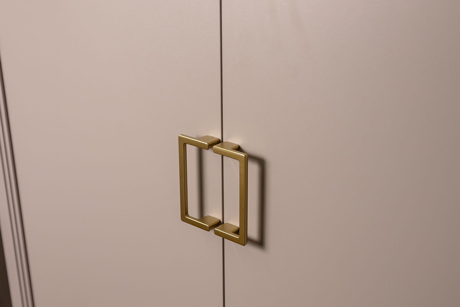 Роскошь серого кашемира в сочетании с фурнитурой под золото выглядит солидно и эффектно. Совмещенные вместе ручки образуют прямоугольник, дублирующий общую геометрию мебели. Фасад рамочной конструкции обрамлен двойными филенками. Опоры изделия скрыты элегантным декоративным цоколем, окрашенным в основной тон. Такая модель станет отличным вариантом для оформления спальни, гостиной, прихожей или детской в стиле ар-деко, классика, модерн.
