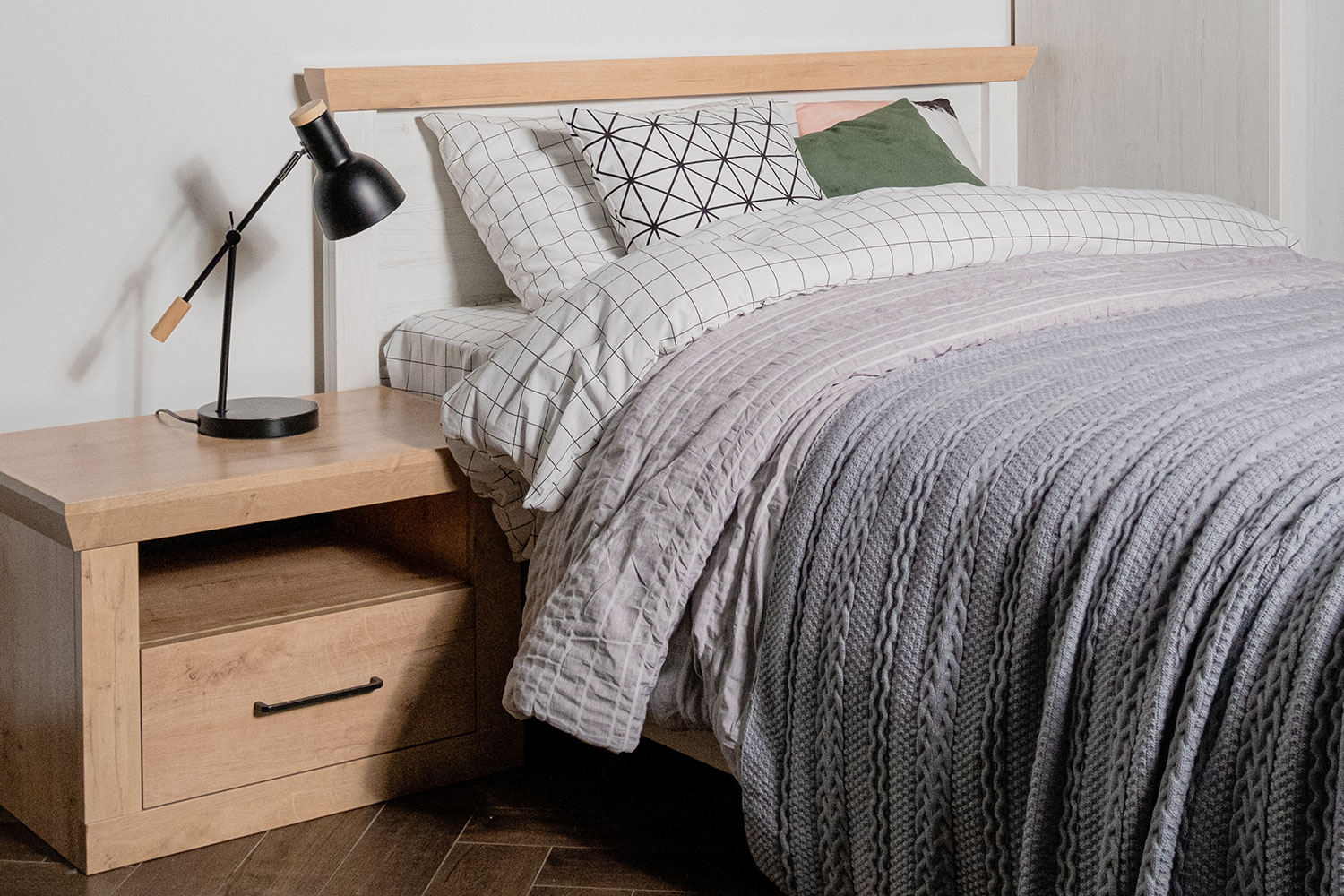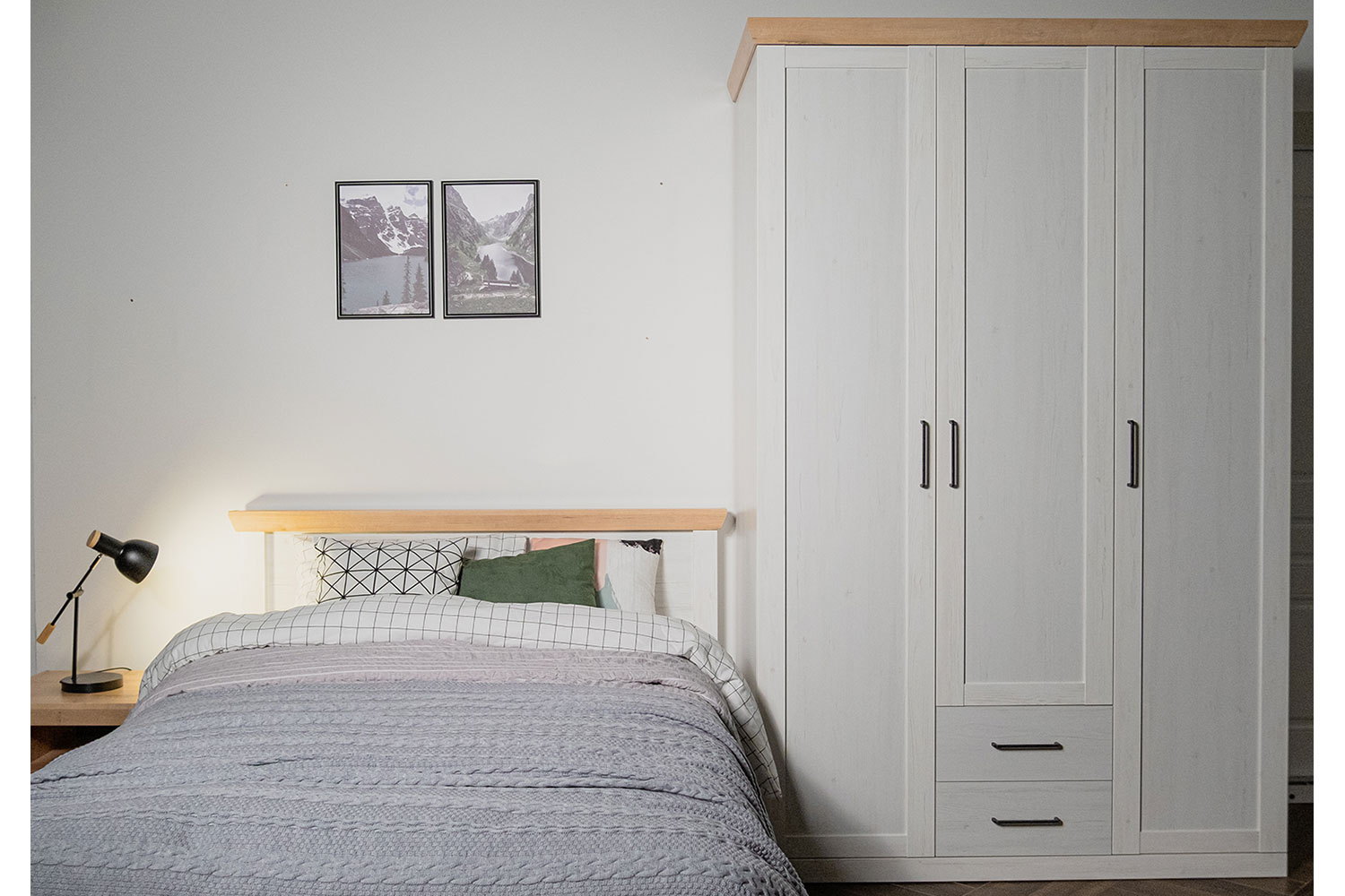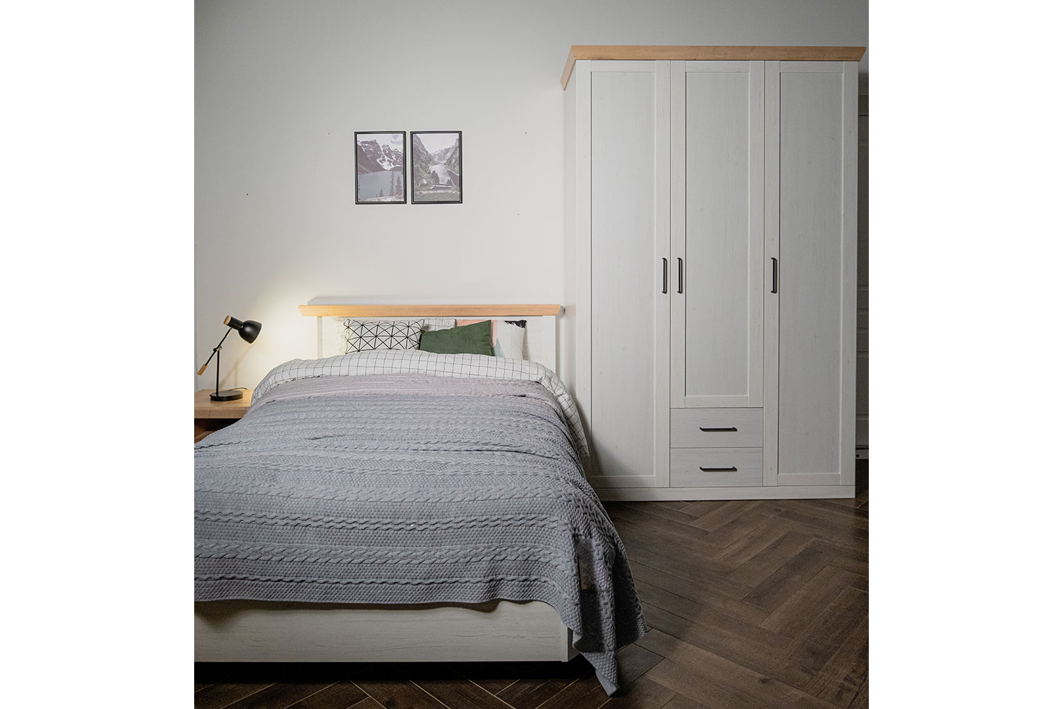 Лаконичная модель «Магнум» выполнена в оттенке «блан-шене». Теплый цвет древесины «дуб бунратти» разбавляет стерильность белоснежных поверхностей. Мебель выглядит гармонично за счет рамочной конструкции изголовья и закругленных углов спального ложа. Благодаря минималистичному дизайну, сдержанной цветовой палитре, отсутствию лишних деталей односпальная кровать идеально впишется в интерьер в стиле сканди, лофт, фьюжн и классика.