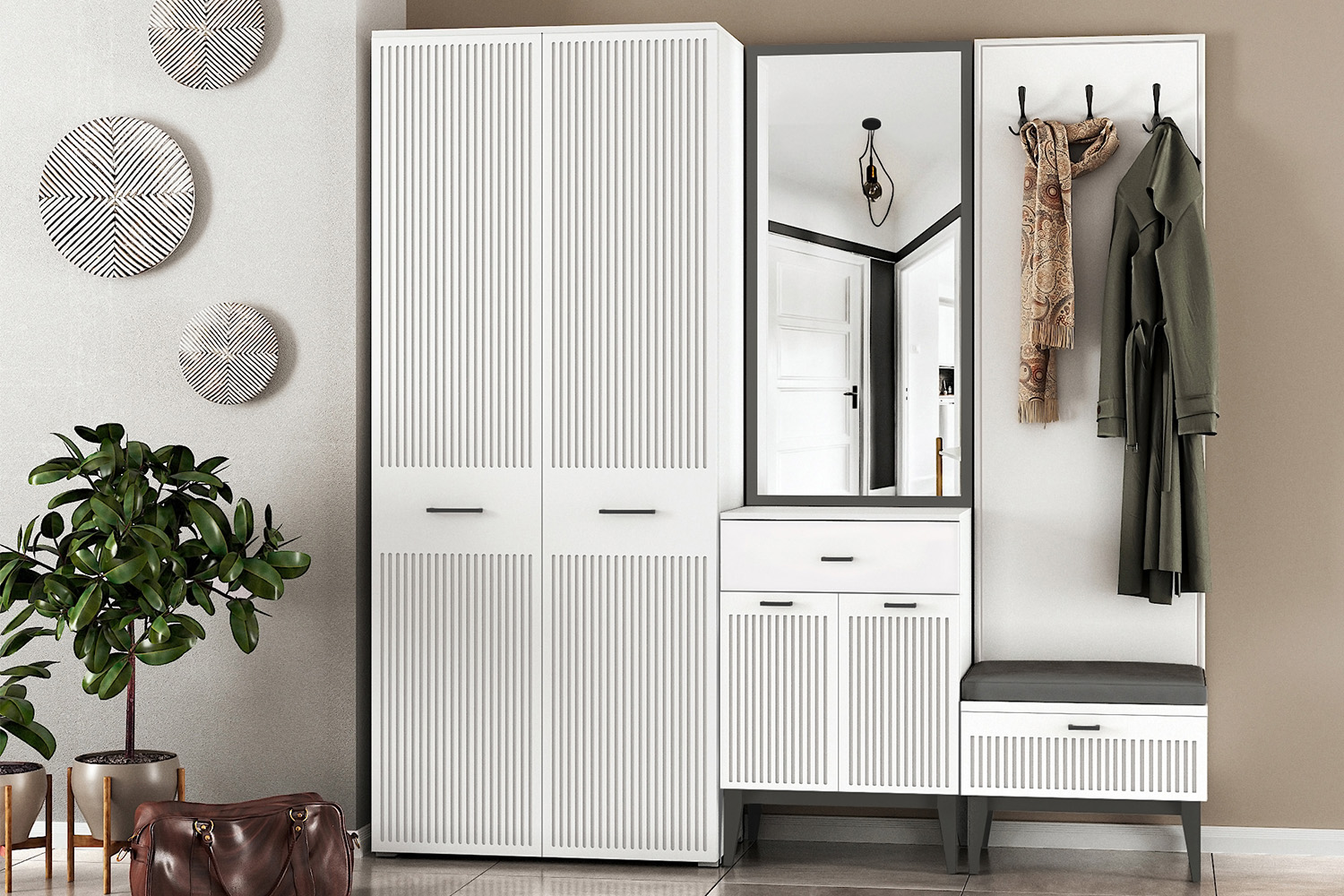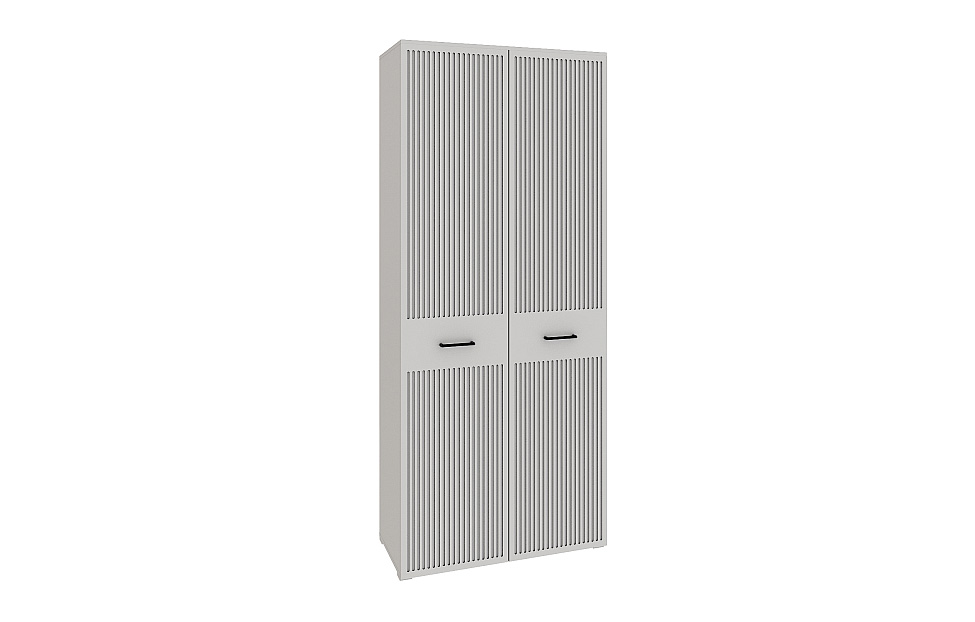 Оригинальный дизайн подходит для прихожей, гостиной или спальни в стиле ар-деко. Необычные фрезерованные поверхности цвета «белый премиум» в сочетании с черными матовыми ручками привлекают к себе внимание с первого взгляда. Глухие фасады снабжены распашным механизмом с доводчиками, что обеспечивает мягкое, плавное движение петель. Внутри изделие состоит из двух основных отсеков: узкого отделения с полками и просторной секции для одежды с полкой-антресолью и выдвижной штангой. Регулируемые по высоте ножки позволяют устанавливать мебель даже на неровное покрытие.