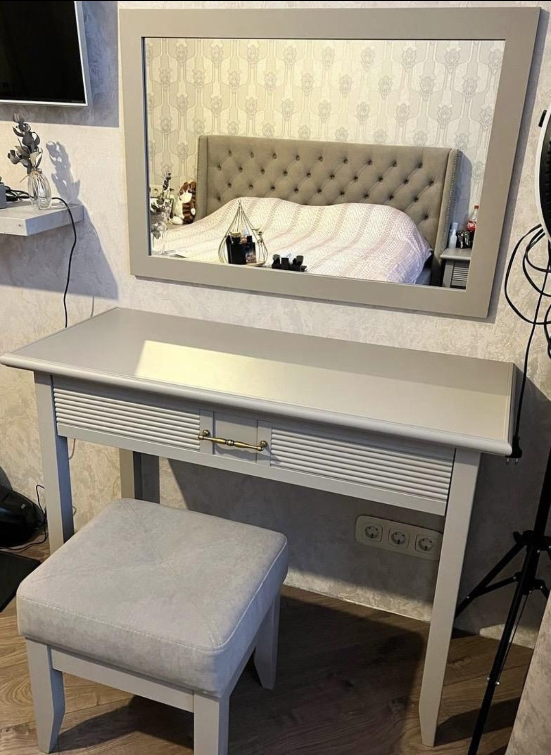 Купили сразу стол и зеркало на этом сайте. Чтобы всё было одного стиля. Стол очень большой и вместительный. В ящик стола вместилась вся косметика, благодарю чему поверхность стола остаётся свободной от визуального мусора. Стол качественный, можно не бояться что-то пролить. Собирал муж, ушло около 20 минут.
