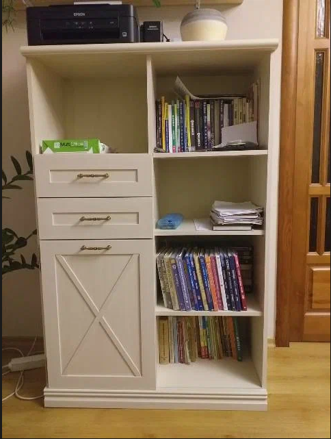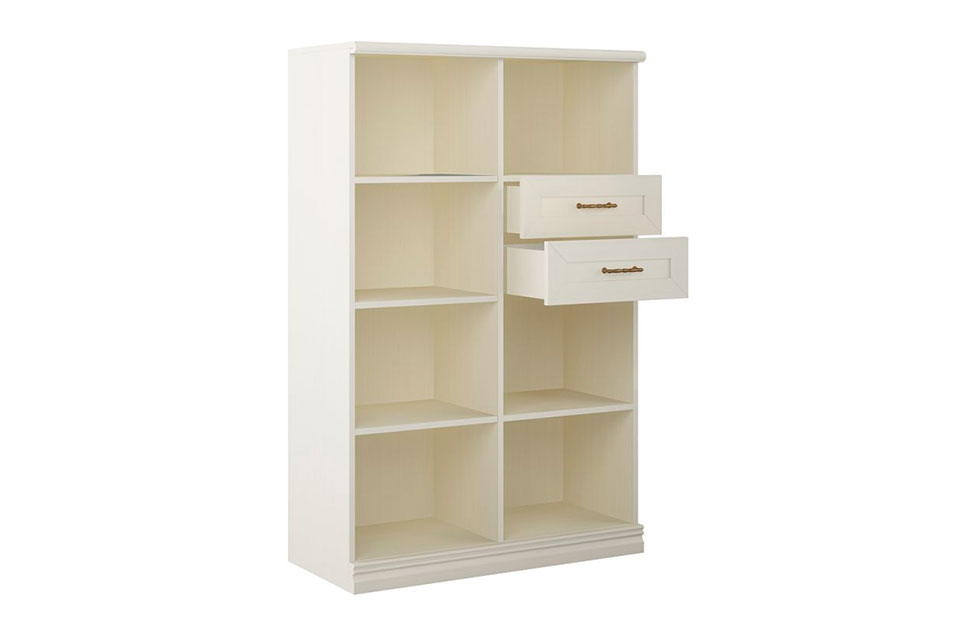 - Шкаф с двумя секциями по ширине (одна секция — с тремя полками, вторая — с двумя выдвижными ящиками и отделением с полкой за распашной дверью);