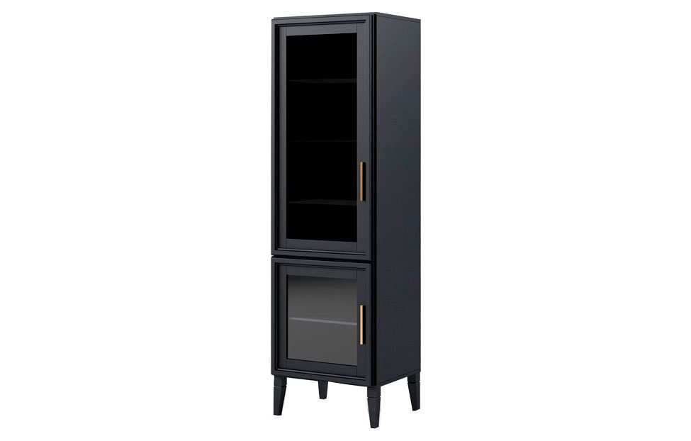 - В нижней части за распашной стеклянной дверцей одно отделение со шпонированной внутренней полкой, в верхней части за распашной стеклянной дверцей отделение с тремя стеклянными полками;
