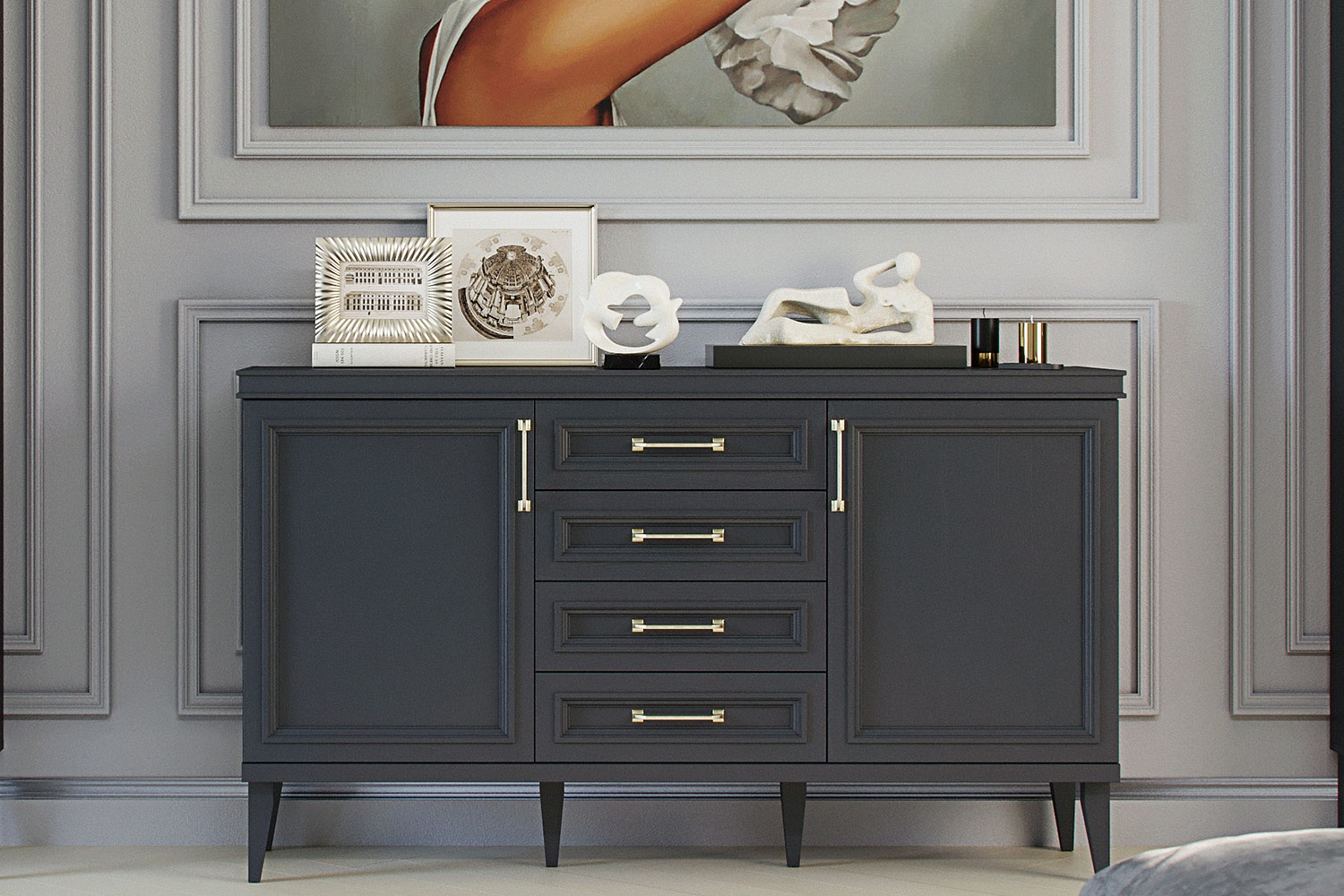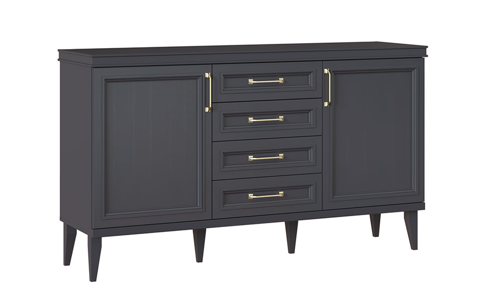 Комод состоит из трех отделений — центрального с четырьмя выдвижными ящиками и двух боковых с распашными дверцами. За левым и правым фасадами прячутся прочные полки из ламинированной ДСП. Ящики оснащены скрытыми направляющими, которые обеспечивают максимальный доступ ко внутреннему пространству и гарантируют бесшумную эксплуатацию изделия. Для данного товара доступны доставка и сборка.