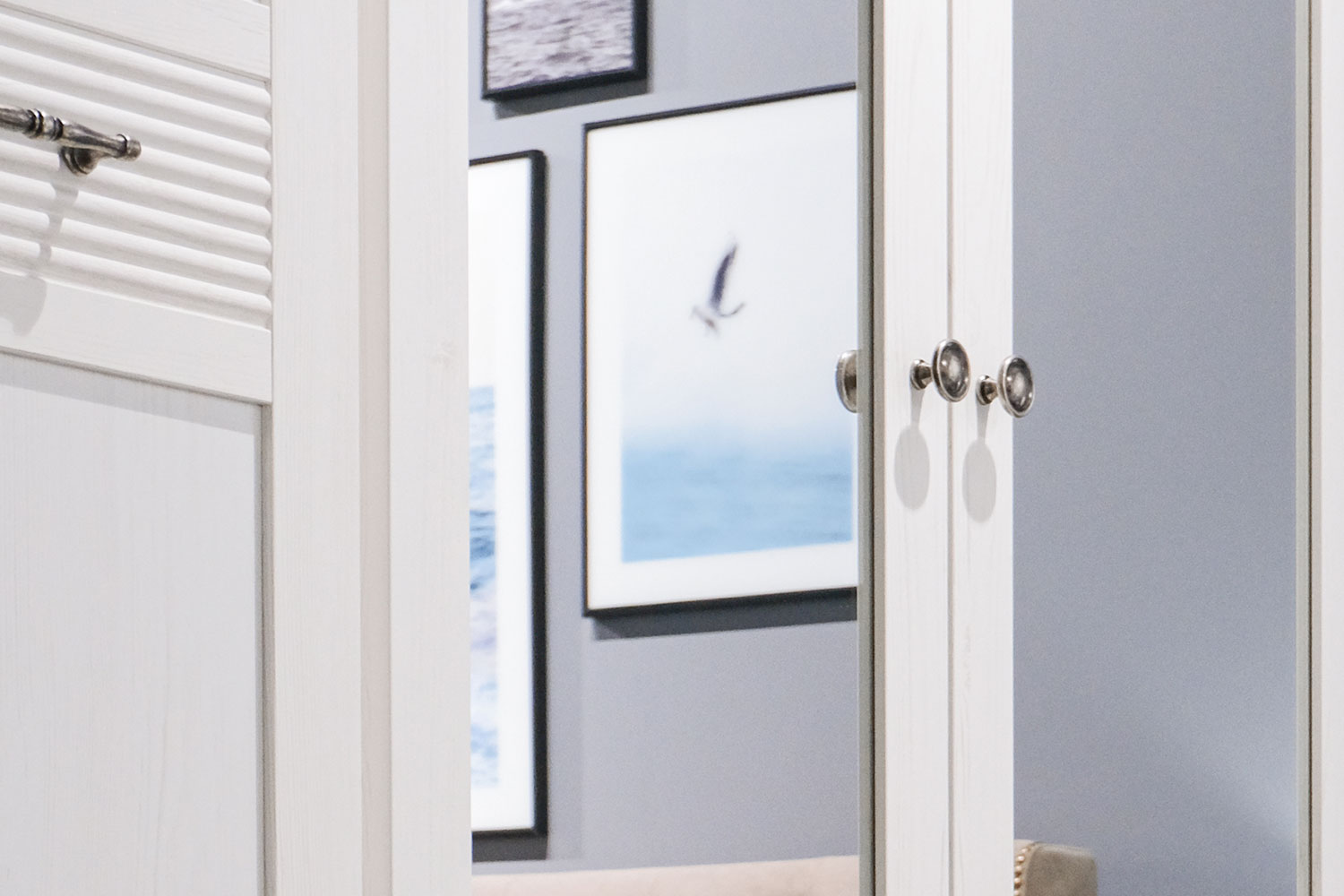 - Шкафы, комод и кровать украшены изящными фахверками. Эти декоративные элементы отсылают к Старой Европе и создают дополнительные неброские акценты в интерьере;