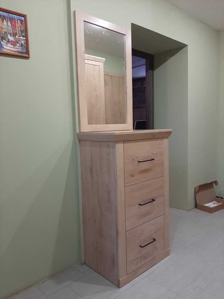 - Мебель выполнена в цвете «дуб бунратти», имитирующем натуральное дерево;