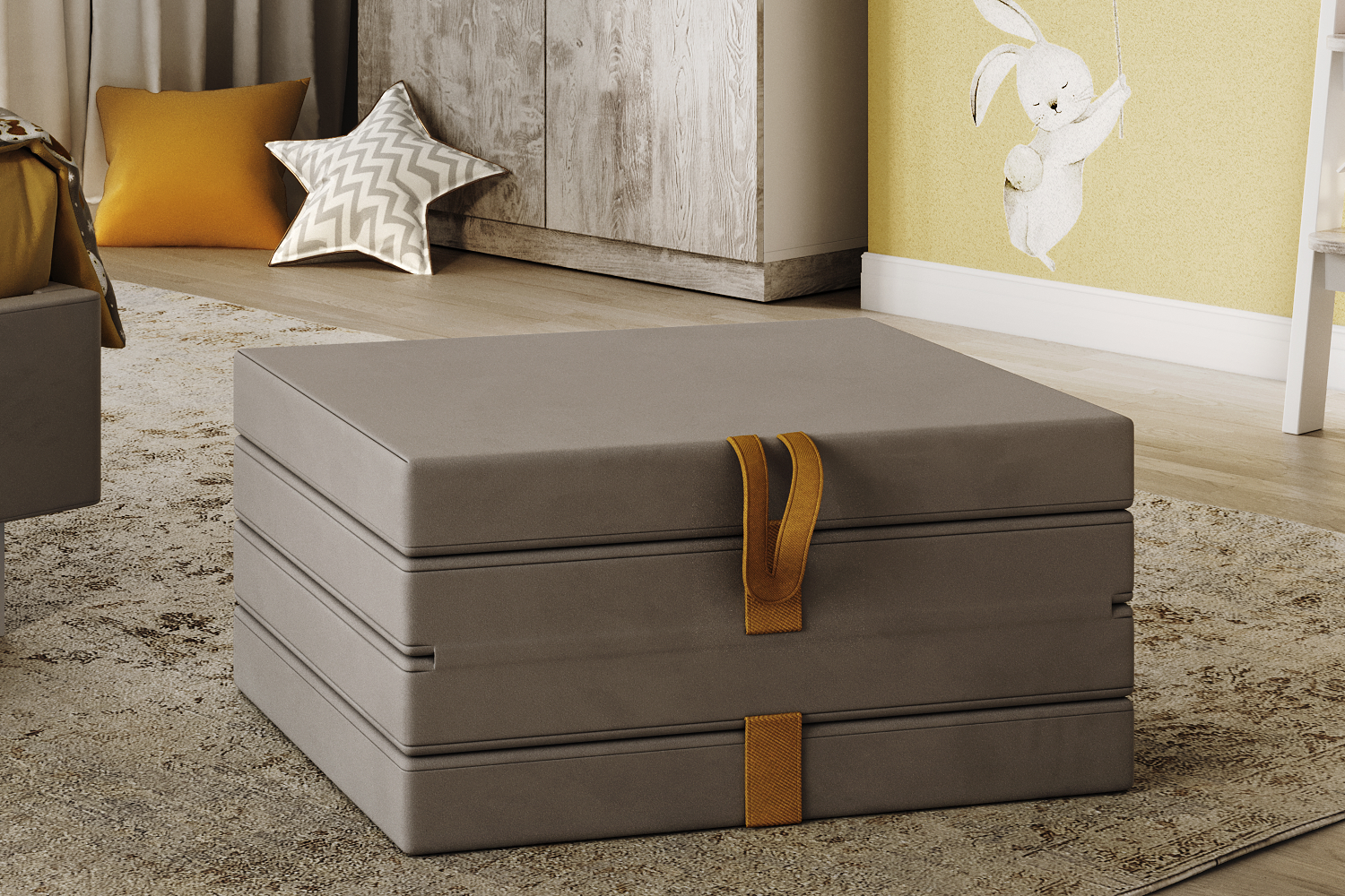 • Состоит из четырех мягких элементов, соединенных тканевой петлей, позволяющей трансформировать его в удобное спальное место (матрас), или в мягкое кресло-пуф;