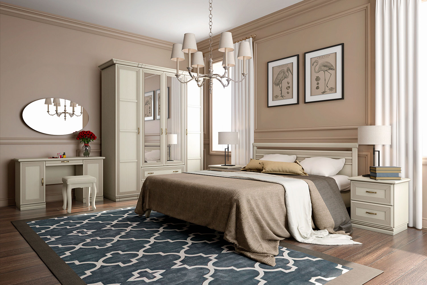 Чтобы сделать интерьер более завершенным, вы можете дополнительно приобрести металлические аксессуары в бронзовых оттенках и абстрактные постеры с яркими акцентами. Для большего удобства композицию можно завершить мягким пуфом или банкеткой в тон мебели. Конечно же, не забудьте про туалетный столик, который сделает утренние и вечерние ритуалы еще приятнее.
