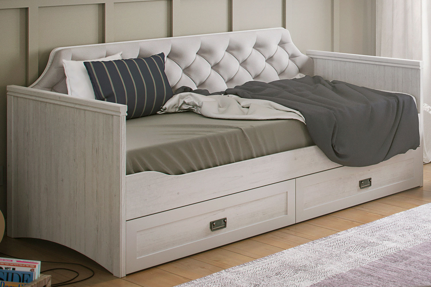 - Кровать одинарная с выдвижными ящиками для белья. Размер спального места: 90 х 200 см. Матрас в стоимость не входят и приобретаются отдельно.