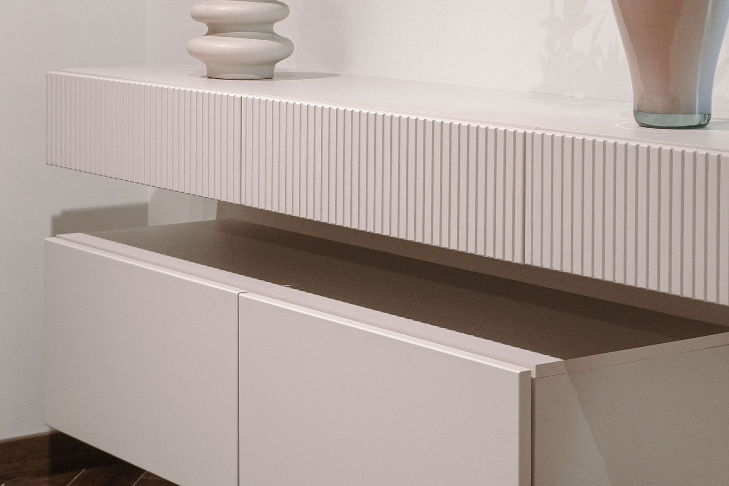 - Две тумбы Дольче ДЛ-323.02 навесные с двумя выдвижными ящиками и фасадами с фрезеровкой;