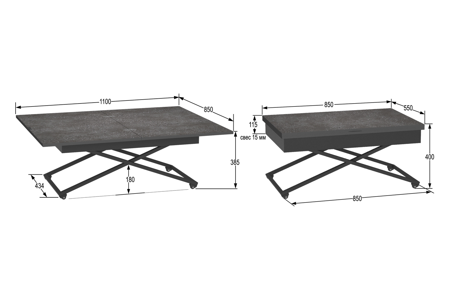 Размеры столешницы в сложенном состоянии 85 x 55 cм, в разложенном — 110 х 85 cм. По высоте стол имеет два положения (разложенный/сложенный): 38,5/40 см и 72,5/74 см. Ножки стола выполнены из прочного металлического профиля, столешница — из ЛДСП. Стол на прорезиненных роликовых опорах, что без труда позволит перемещать его в помещении, при этом не царапая и не повреждая напольное покрытие.