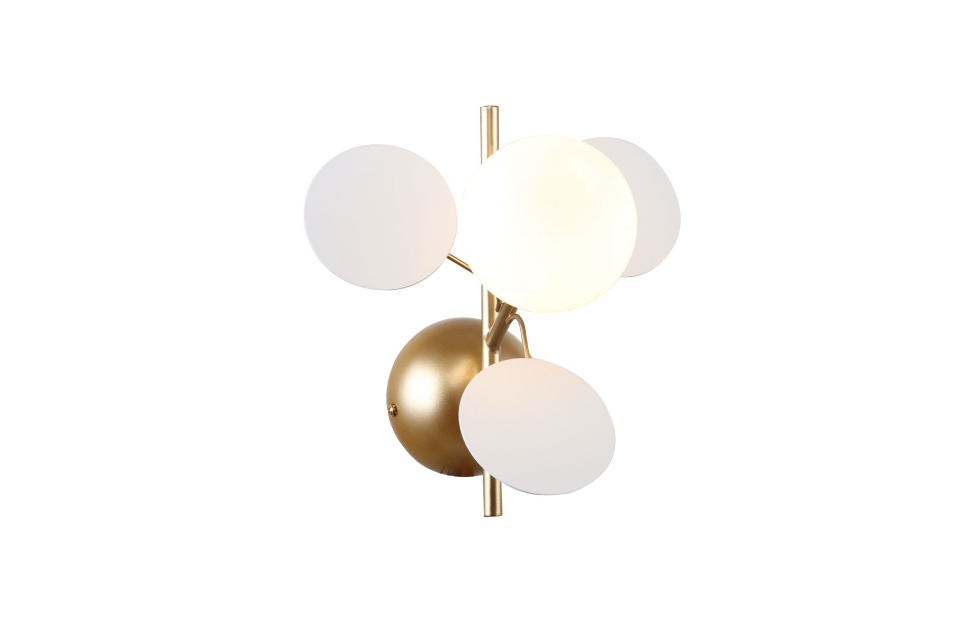Коллекция Bliss – это гармоничное сочетание белого и золотого цветов, представляющее собой переосмысленную версию более разноцветной коллекции Multi Bliss. В основе обеих коллекций лежит одна флористическая идея, но Bliss утонченно акцентирует внимание на элегантности белого и роскоши золотого. Подойдет в интерьеры различной стилистики - от прованса до эклектики. Металлический каркас золотого цвета, круглый стеклянный плафон молочного цвета, декоративные круглые белые пластины, декоративный золотой шар.