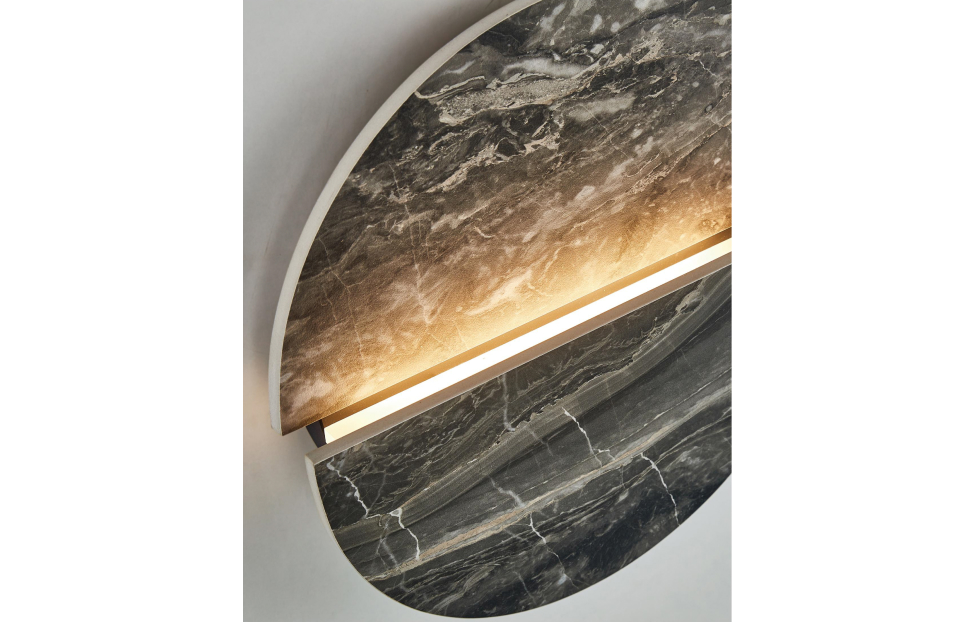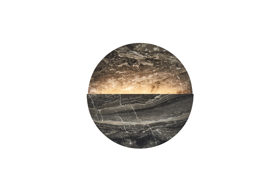 Представляем вам коллекцию Eclipsis, словно созданную самой природой. Настенный светильник представляет собой две половинки диска из керамогранита в цвете сеый мрамор, между которыми струится мягкий свет, создавая завораживающее зрелище, напоминающее затмение небесных тел. Узор камня оживает благодаря игре света (LED-модуль с рассеивателем из акрила белого цвета) и усиливает оптический эффект.
