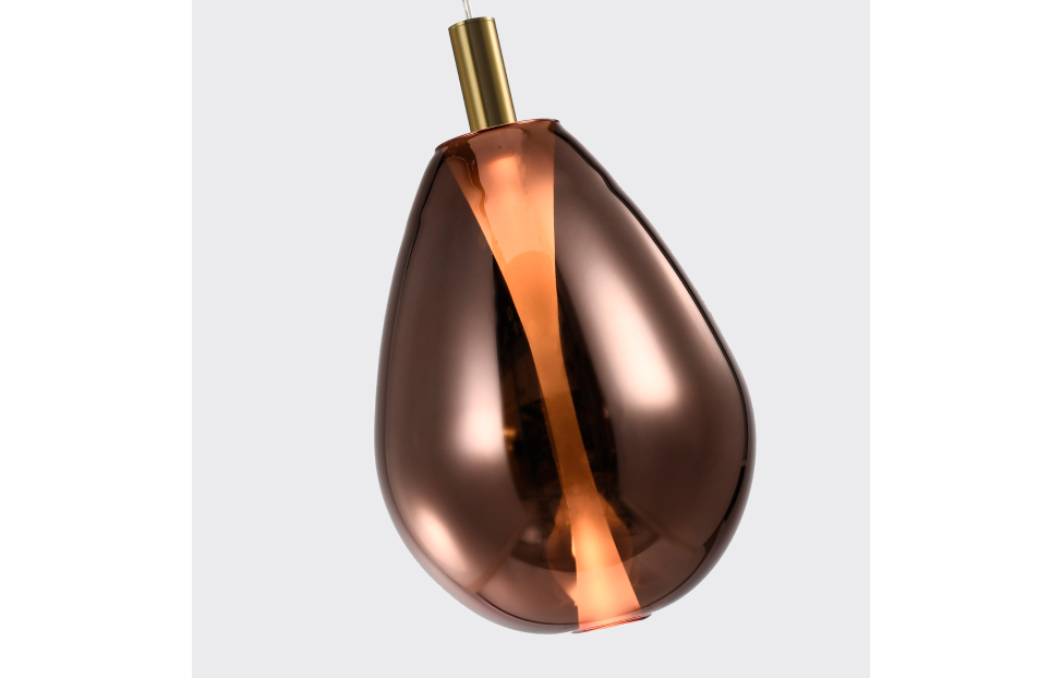 Особенностью подвесов Hopper является декоративный элемент в центре, формируемый в процессе выдувки стекла, который создает сложную и интересную форму плафона, становится основой его неповторимого облика. Плафон подсвечивается изнутри светодиодным источником света, создавая эмоциональное волнующее освещение. Подвес с каркасом в цвете латунь, с плафоном в медном цвете, регулируемая высота.