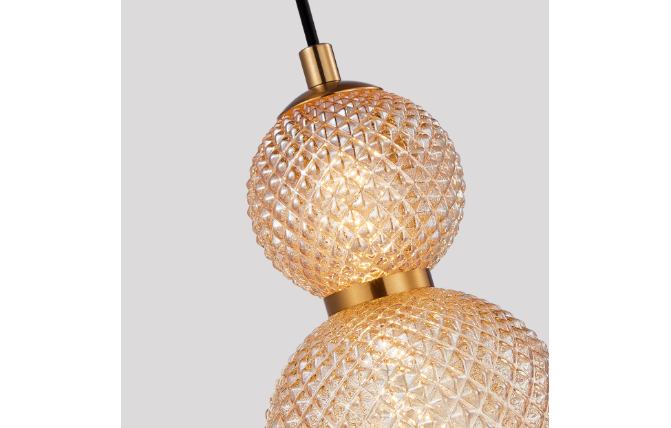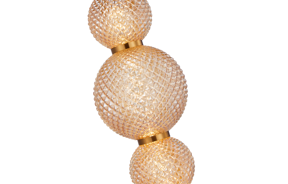 Коллекция Kiran – это гармония стекла и света. Стеклянные фактурные плафоны раскрывают свой характер в мягком струящемся свете и узорных отражениях на потолке, стенах, предметах мебели. В качестве источника света используется трубка с LED-модулем, проходящая внутри плафонов из янтарного фактурного стекла. Декоративный ободок золотого цвета добавляет сдержанного блеска в дизайн коллекции и придает ей особую привлекательность. Регулируемая высота.