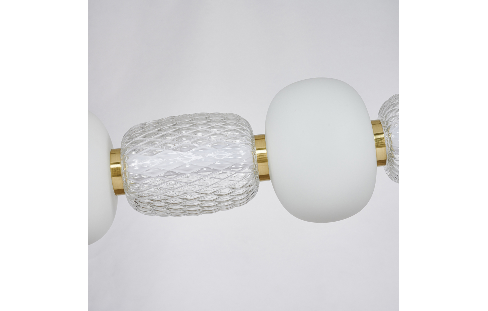 Чередование стеклянных плафонов разной формы, цвета и рисунка, а также цветовое решение каркаса в золоте создает насыщенный сложный и дорогой образ. Металлический каркас цвета золота, плафоны в виде бусин разнообразных форм из выдувного стекла двух видов - прозрачного и цвета опала, часть каркаса фиксируется тросиком для баланса.