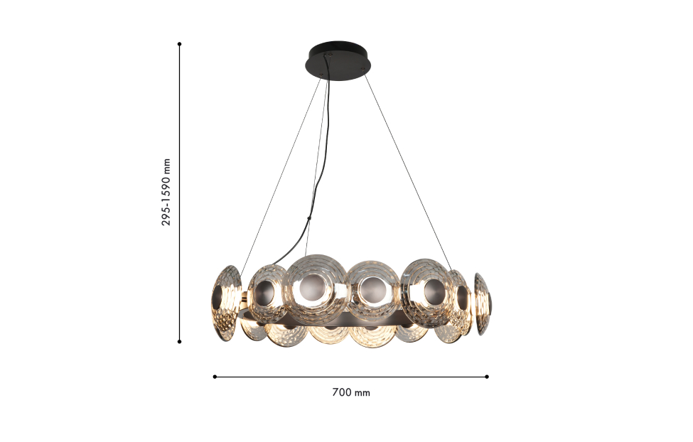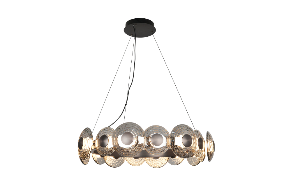 В основе дизайна светильников Claros лежат стеклянные закругленные фактурные плафоны, напоминающие изящные тарелки, между которыми встроены модули LED, создающие мягкое и комфортное освещение. Коллекция включает в себя одиночные подвесы, люстры, а также два вида настенных светильников, что позволяет создавать комплексное освещение пространства в едином стиле. Люстры можно легко комбинировать в оригинальные световые композиции, используя универсальные крепления, что дает простор для творческих решений и индивидуального подхода к оформлению интерьера. Металлический каркас черного матового цвета, закругленный фактурный плафон из стекла дымчато-серого цвета, регулируемая высота, LED-модуль.