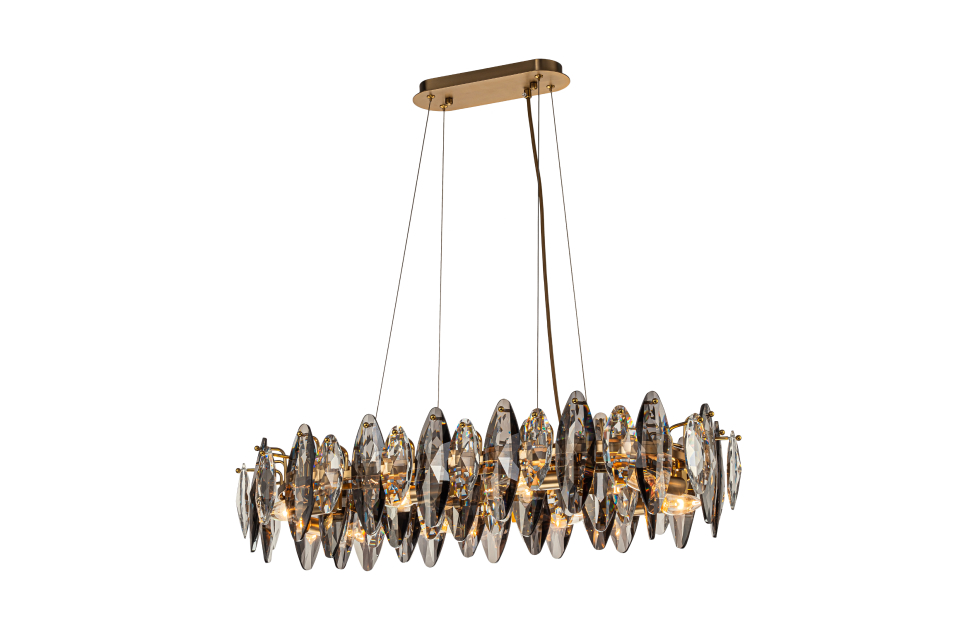 Glans – элегантная кольцевая коллекция, в которой используется прозрачный и серебристо-дымчатый хрусталь в ритмичном чередовании. Металлическая арматура светильника скрыта за хрустальными лепестками, создавая ощущение легкости и невесомости. К этой серии подходят универсальные крепления с помощью которых можно создать кольцевые композиции из нескольких люстр. Подвесная кольцевая люстра длиной 80 см, каркас в бронзовом цвете, лепестки прозрачного и дымчато-серого хрусталя разного размера, регулируемая высота.