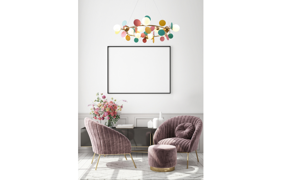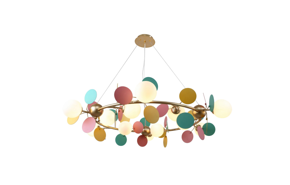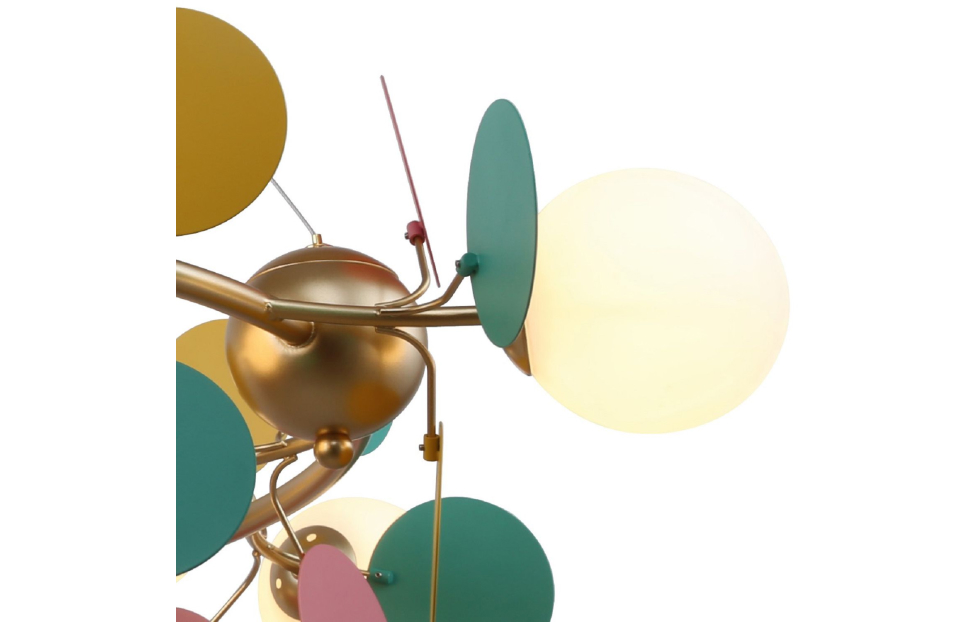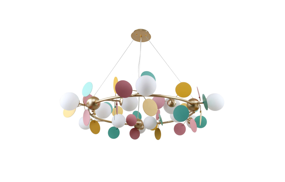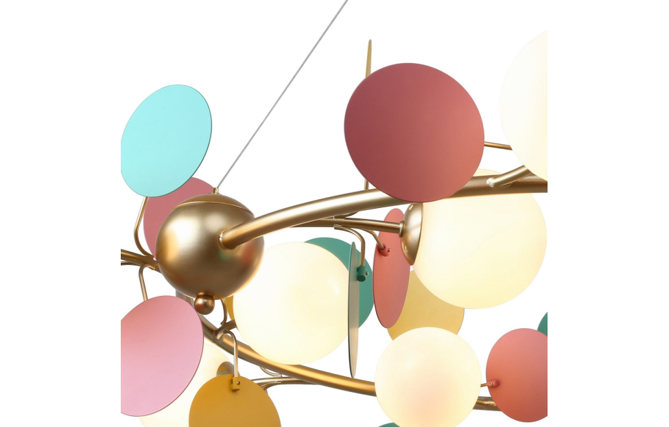 Multi Bliss поражает своим буйством красок и контрастом. Светильники из коллекции Multy Bliss чаще всего используют для детских комнат, чтобы создать уютную и игривую атмосферу. Декоративные круглые разноцветные пластины люстры и бра создают яркий и эффектный акцент в интерьере, придавая ему оригинальность и индивидуальность. Металлический каркас золотого цвета, круглые стеклянные плафоны молочного цвета, декоративные круглые разноцветные пластины, декоративные золотые шары, регулируемая высота.