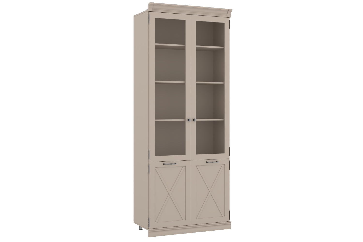 - В верхнем отделении — три съемные полки ЛДСП за двумя распашными рамочными дверями (вставки стекло), в нижнем отделении — одна съемная полка ЛДСП за двумя распашными рамочными дверями;