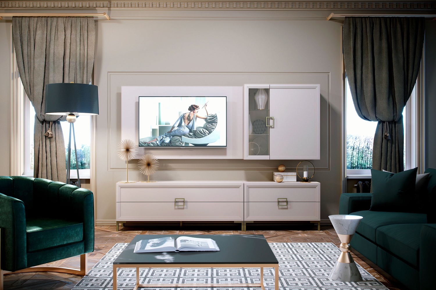 Уютный мебельный гарнитур в сдержанном теплом оттенке дополнит интерьер в стиле минимализм или ар-деко. В комплект входят две вместительные тумбы с выдвижными ящиками и 1 компактный навесной шкаф с горизонтальными отсеками. Рамочный фасад имеет вставку из тонированного стекла, внутри расположены прочные стеклянные полки. Завершающим штрихом композиции служит ТВ-панель, по длине соответствующая нижней тумбе, за лицевой частью которой установлена LED-подсветка.