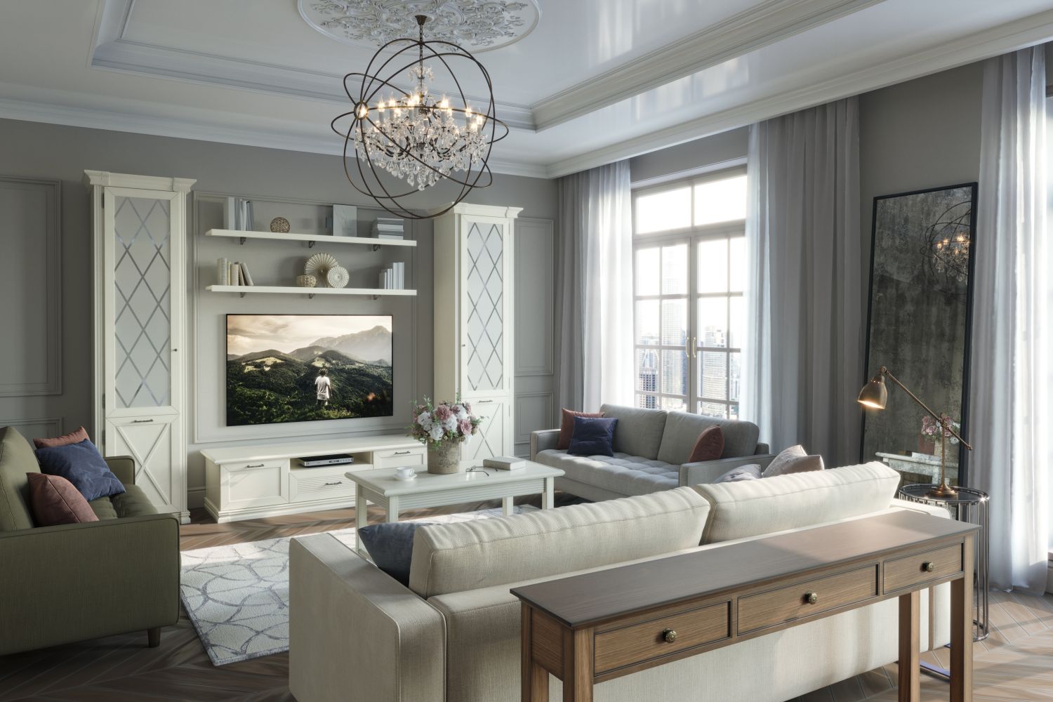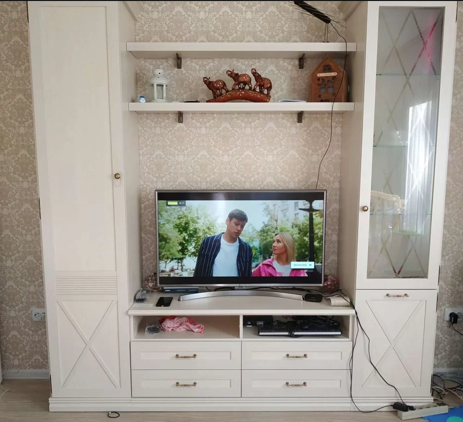 Мебель выполнена из экологичной древесной плиты. Рамочные фасады украшены стильными латунными ручками, отделанными под античную бронзу. Меблировка отличается вместительностью: два высоких шкафа с застекленным верхом, ТВ-тумба и настенные полки позволяют хранить под рукой все необходимые вещи. Бесшумную эксплуатацию обеспечивает система скрытых направляющих со встроенным демпфером и петли с доводчиками. Качественная фурнитура гарантирует надежность крепления.