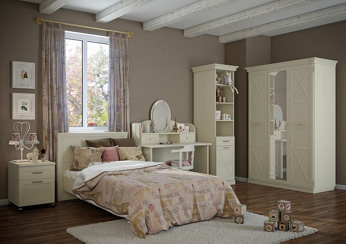 Элегантный трехдверный платяной шкаф станет прекрасным решением для оформления детской, молодежной комнаты, прихожей, спальни, гостиной в стиле кантри или неоклассика. Рамочные фасады украшены горизонтальной фрезеровкой и легкими, изящными линиями фахверков, выдержанные соответствующим образом карниз и цоколь дополняют внешний облик мебели. Матовые поверхности текстурированы под дерево и окрашены в светлый оттенок «валенсия». Строгую симметрию изделия подчеркивает центральная зеркальная вставка. Завершающим штрихом служит фурнитура с покрытием под «сатиновое золото».