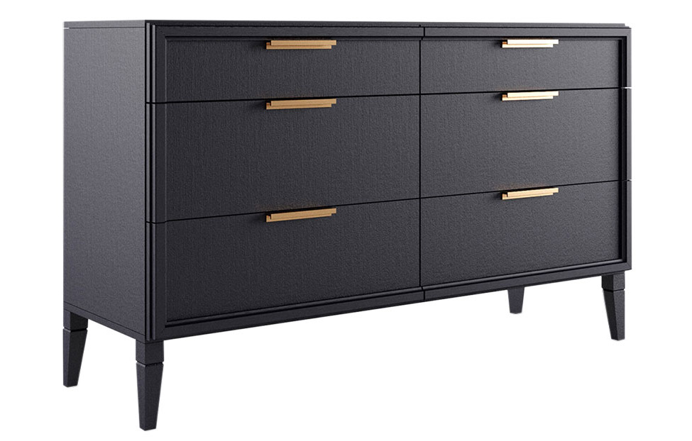 Эффектный комод украсит как аристократическую гостиную, так и современное помещение в американском стиле. Глубокий серый цвет идеально впишется в любое цветовое окружение. Матовые поверхности оттенка «шафран» дополнены элегантными прямоугольными ручками, отделанными «под золото». Фасады облицованы дубовым шпоном, рамы и резные ножки изготовлены из массива дуба. Натуральные первосортные материалы оттеняют респектабельность и внешнюю дороговизну изделия. Модель вместительна, состоит из четырех габаритных ящиков и двух элементов типового размера, с соответствующей нагрузкой 6-8 кг и 4-6 кг. Инновационная немецкая фурнитура обеспечивает плавный ход и безупречное функционирование скрытых направляющих и выдвижных механизмов.