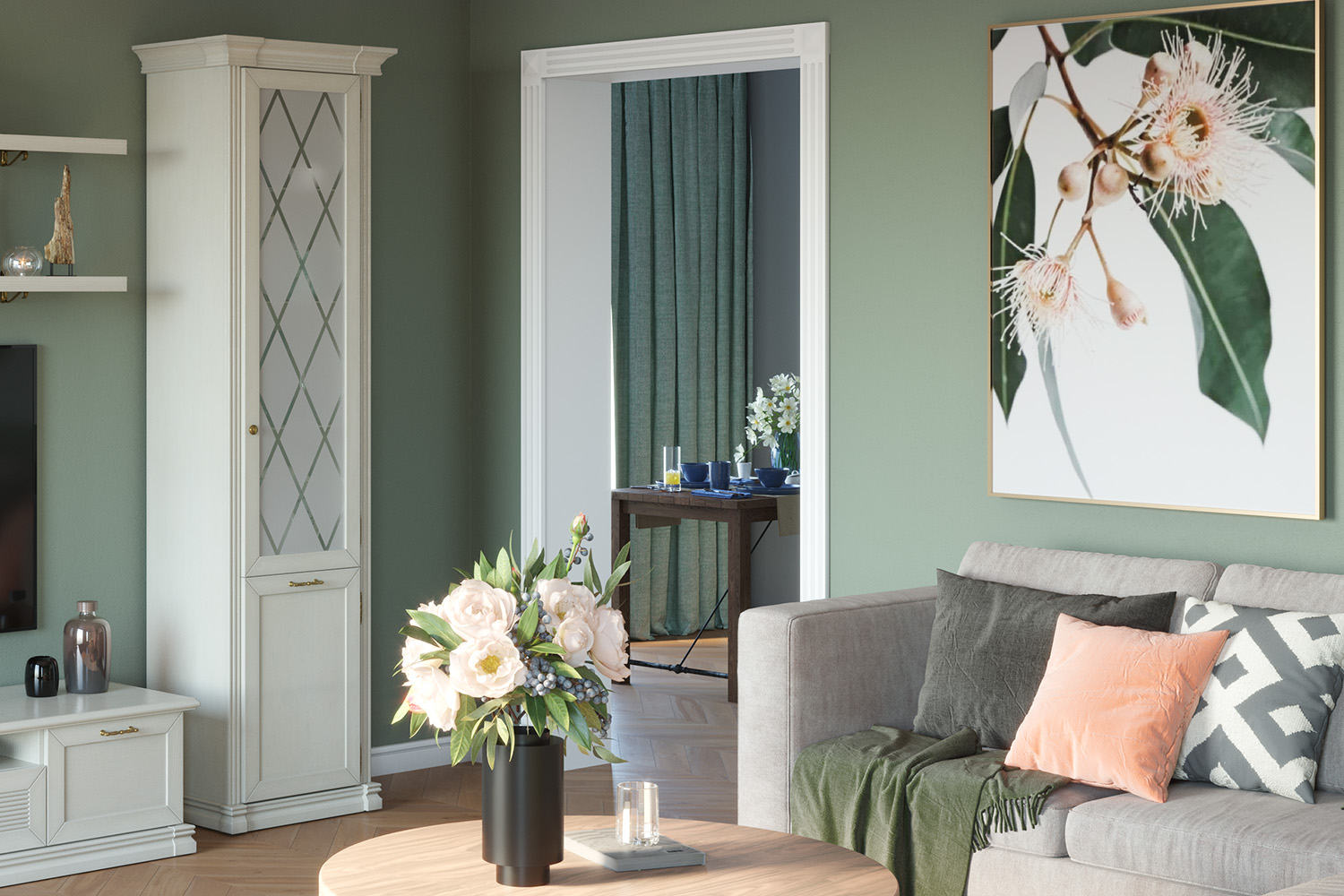 - Двухдверный шкаф многоцелевого назначения со стеклянным верхним и глухим нижним фасадами;