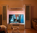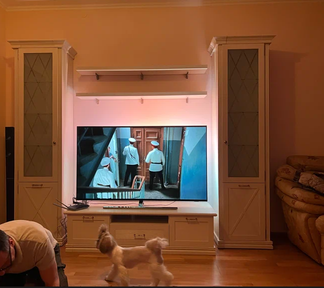 • В гостиной есть вся необходимая мебель для хранения: два напольных шкафа, большая тумба сразу с тремя отделениями и две полки. Для самого важного всегда найдется место;