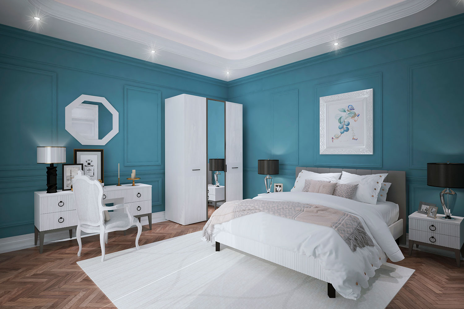 Комплект состоит из трехстворчатого шкафа, кровати с мягким изголовьем, двух небольших тумб и стола с пятью выдвижными ящиками, который с легкостью заменит привычный туалетный столик. Высокие скошенные опоры из массива бука облегчат уборку, а настенное зеркало и зеркальная вставка системы хранения помогут в процессе сборов. Корпусная часть меблировки изготовлена из ЛДСП, а фасады — из МДФ, окутанной ПВХ-пленкой оттенка «белый премиум». Модульность гарнитура предполагает возможность выбора мебельных изделий по размерам и функционалу.